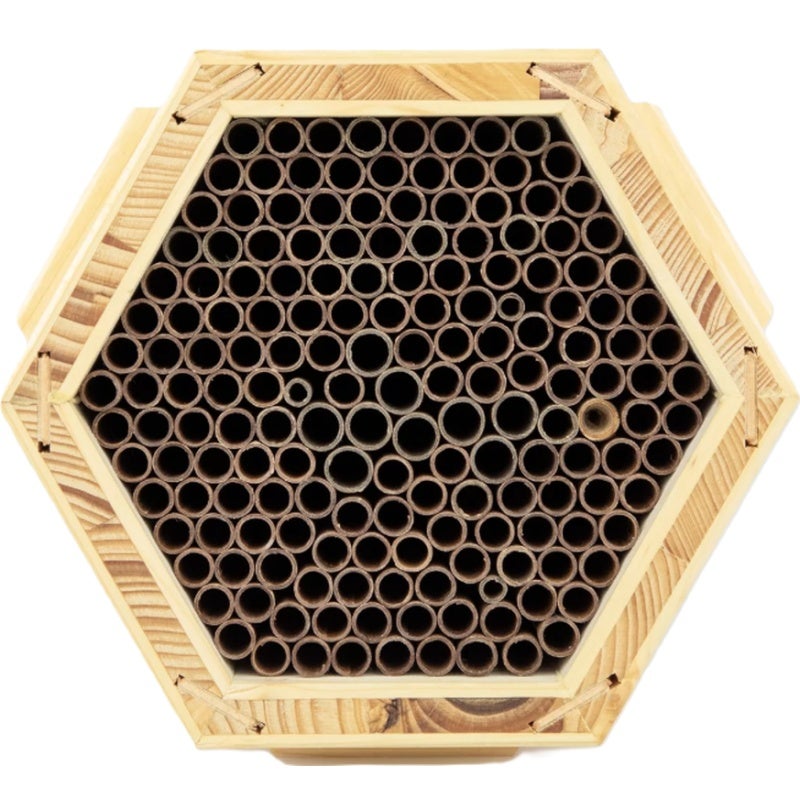 Für die Montage empfiehlt sich der Zeitraum von März bis Mai, damit die Röhrchen zuverlässig besiedelt werden können. Das Sechseckmodul wird mit der beiliegenden Schraube und einer Metallplatte befestigt und lässt sich dadurch flexibel an nahezu jeder Wand montieren. Ein trockener, sonniger und windgeschützter Standort mit Südost-Ausrichtung, etwa 50cm über dem Boden, bietet optimale Bedingungen. Im Winter können ältere Röhrchen ersetzt werden verschlossene Röhrchen sollten jedoch erhalten bleiben, da sie bewohnt sind und im folgenden Frühling junge Wildbienen hervorbringen. Die bewohnten Röhrchen können einfach wieder in das Modul eingesetzt werden. Für zusätzlichen Schutz und eine längere Lebensdauer ist die Aussenseite des Moduls mit Leinöl behandelt.