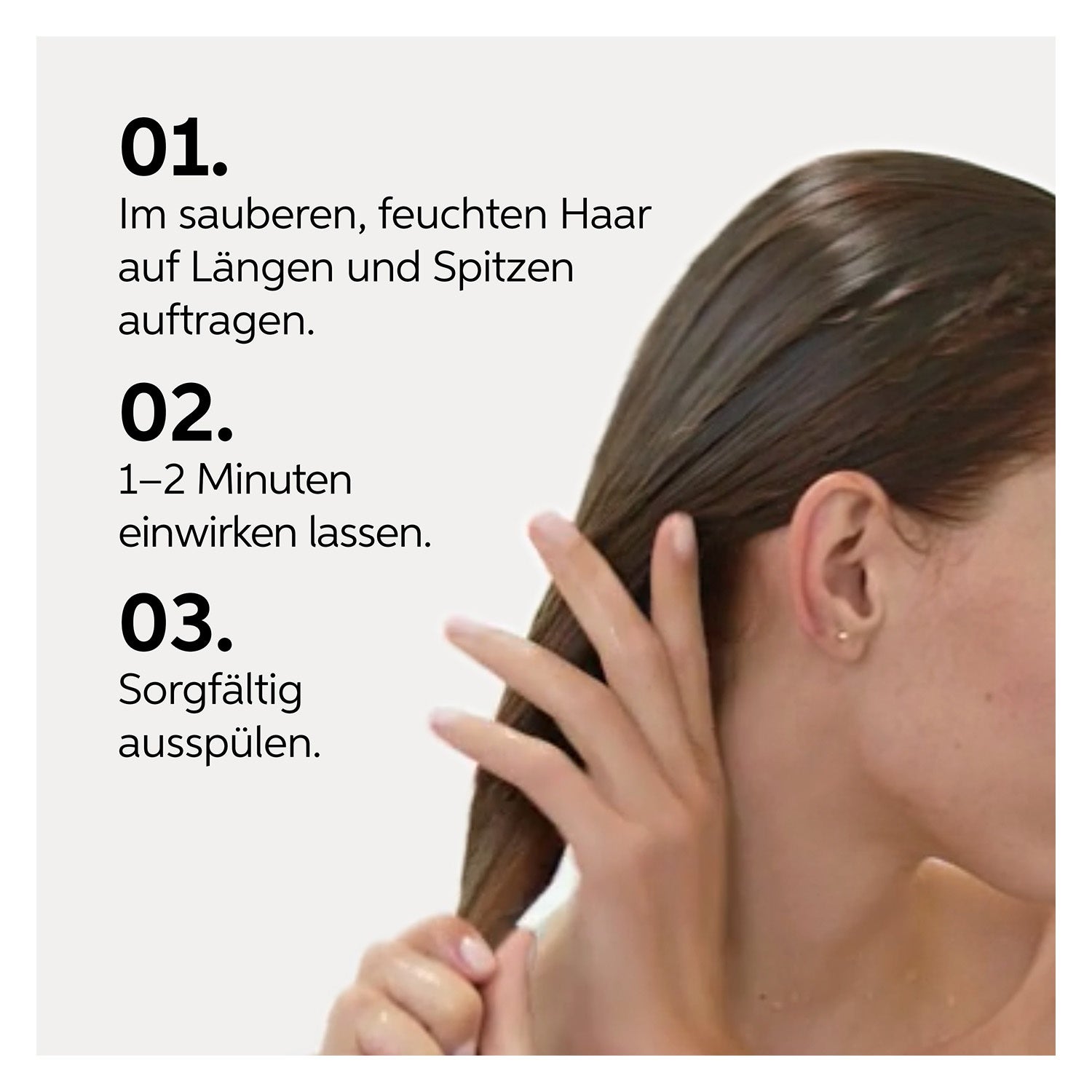 Nach dem Shampoonieren auf das saubere, feuchte Haar auftragen und gleichmäßig verteilen. Gründlich ausspülen.