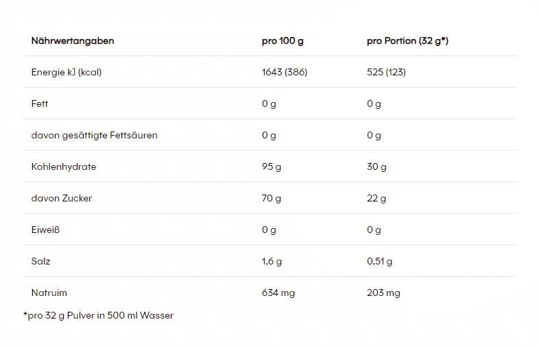 - DIE IDEALE ENERGIEVERSORGUNG mit 30g Kohlenhydrate pro Portion (für 500 ml Wasser) für moderate bis intensive sportliche Belastung. Der Iso Drink versorgt dich nicht nur mit genügend Flüssigkeit, sondern auch mit wichtigem Natrium.