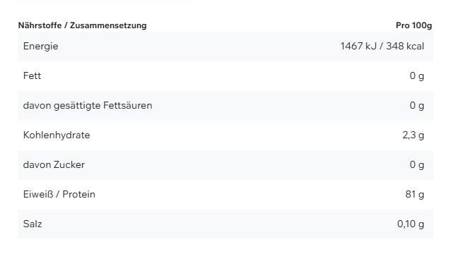 Molkenproteinisolat 93,3 %, Aroma, Säuerungsmittel (Citronensäure, Äpfelsäure), Farbstoff (Ammonsulfit-Zuckerkulör), Süßungsmittel (Sucralose, Acesulfam K). Herkunft Zutaten: EU/Nicht-EU