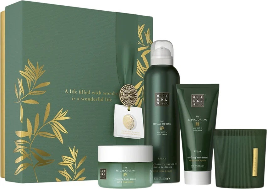 Inhalt: Duschschaum (200ml) Körperpeeling (125g) Bodylotion (100ml) Duftkerze (145g)