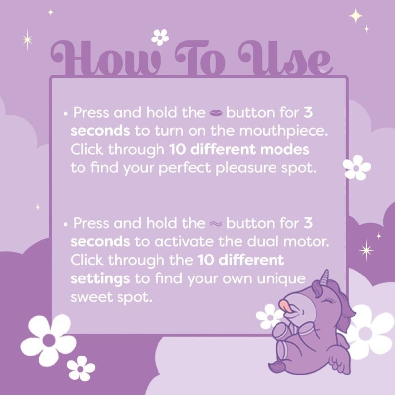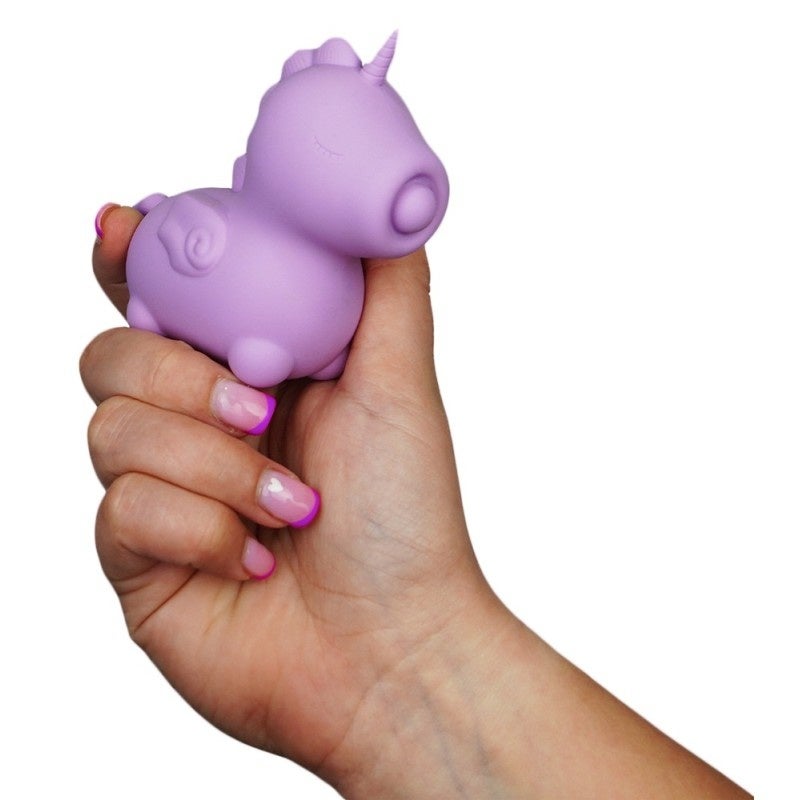 Für zauberhafte Momente! Niedlicher Auflegevibrator Karma Lilac von Unihorn in Form eines kleinen Einhorns. Das weiche griffige Silikon-Toy verwöhnt mit vielseitigen Vibrationen und seinem intensiv pochenden Massage-Schnäuzchen. Der Deluxe-Doppelmotor sorgt dabei für zuverlässige Power. Bequem per Knopfdruck sind jeweils 10 verschiedene Modi der Vibrationen und Klopfmassage getrennt steuerbar. Ein magisches Toy für vielseitige Spiele – allein oder zu zweit – zuhause oder unterwegs! 9cm x 9cm x 4cm. Gewicht 98g. Silikon. Wiederaufladbar – inklusive USB-Ladekabel.