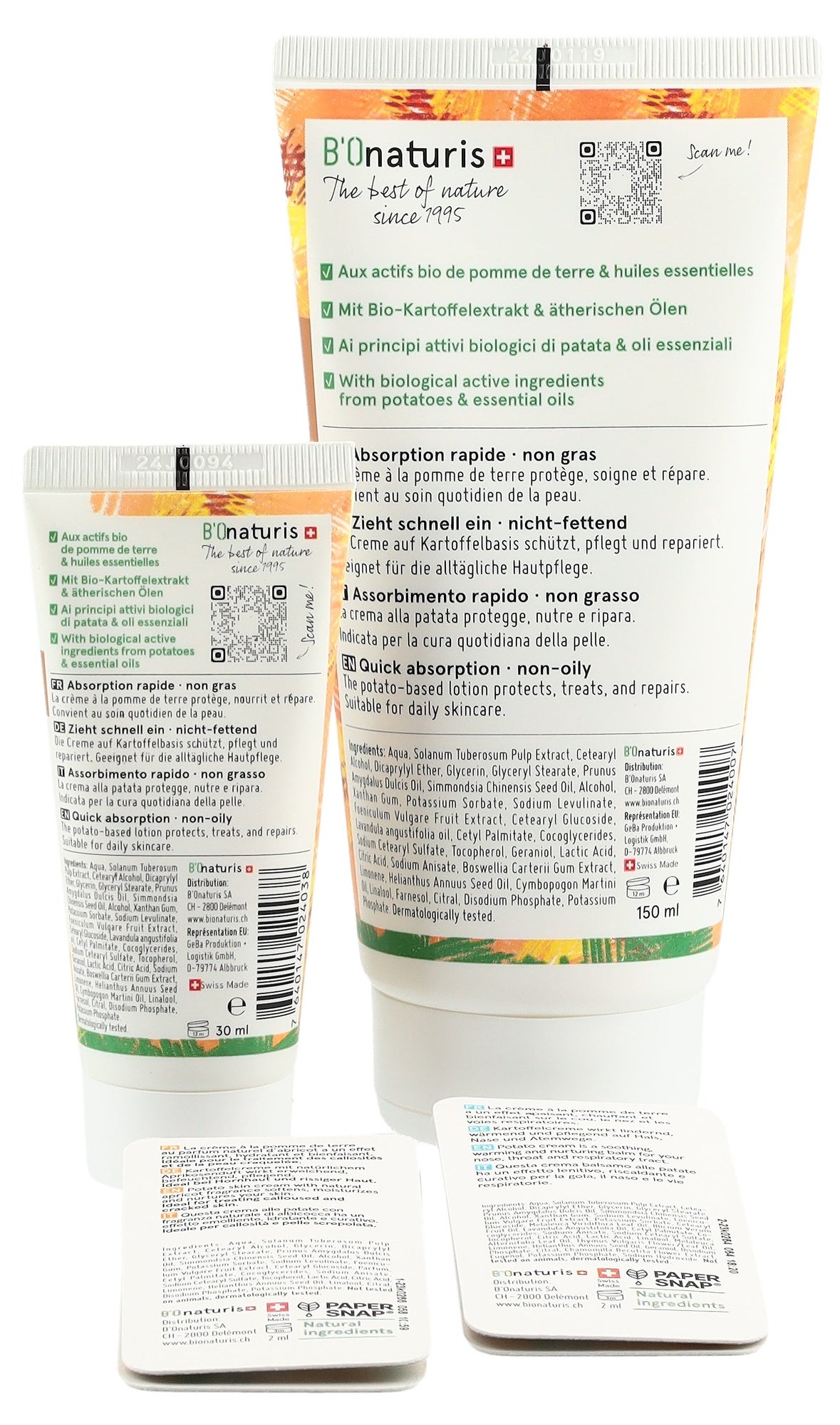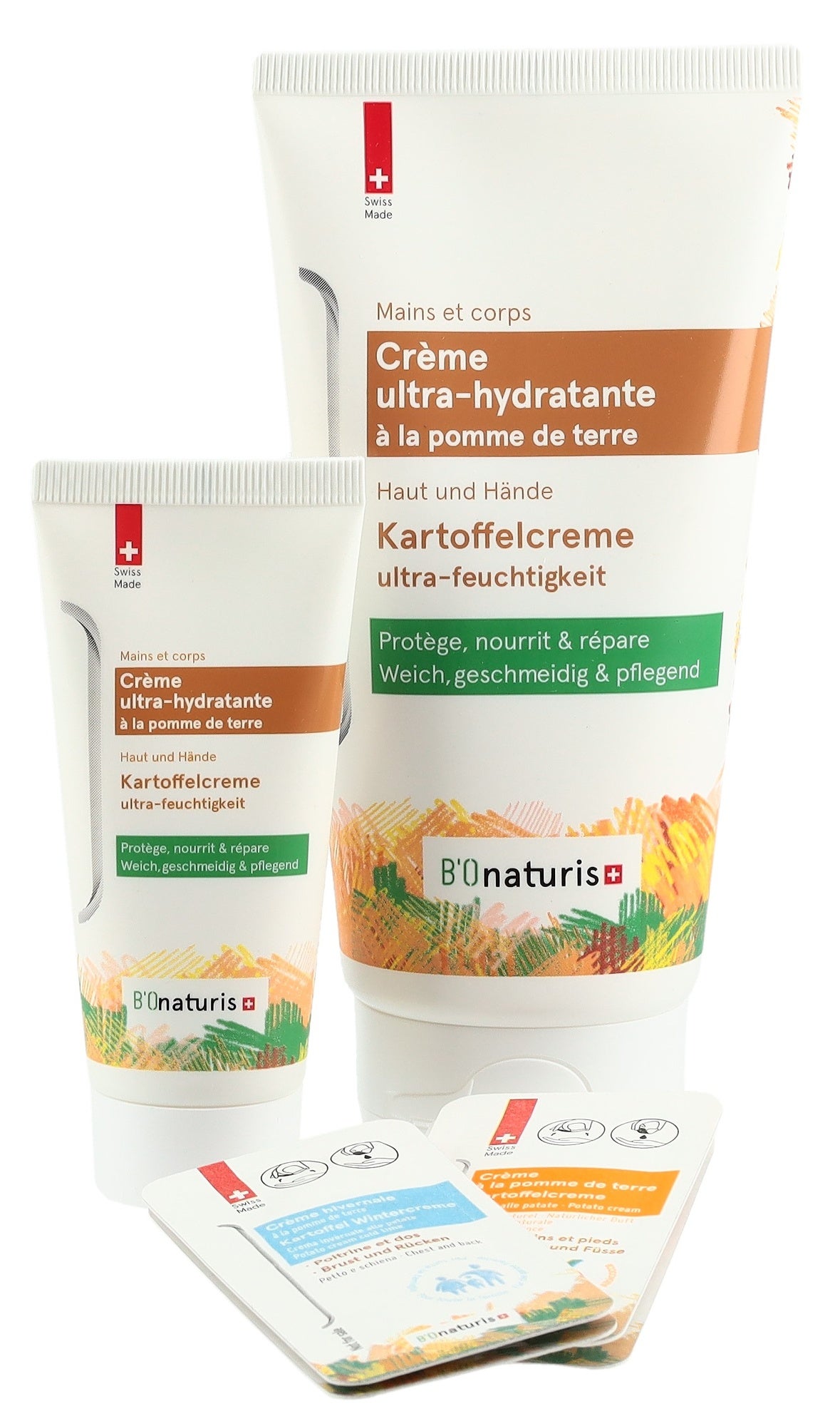 Die Creme auf Kartoffelbasis schützt, pflegt und repariert. Geeignet für die alltägliche Hautpflege. Dermatologisch getestet.