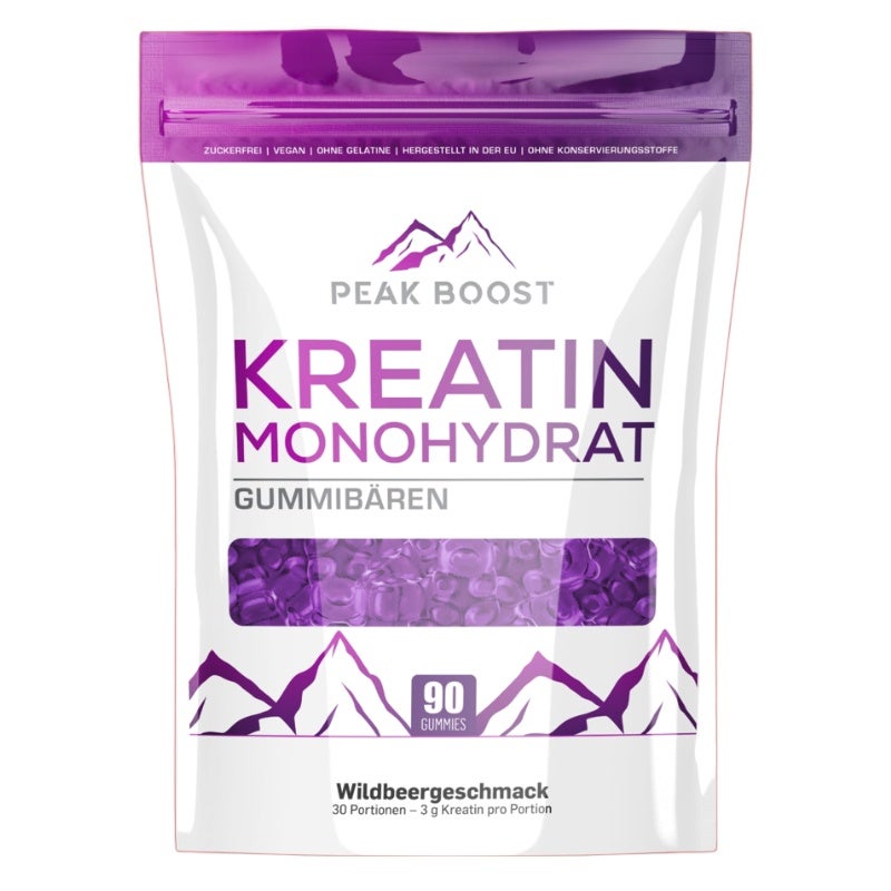 Peak Boost Kreatin Monohydrat Gummibären sind eine moderne und praktische Alternative zu Kreatinpulver und Kapseln. Jede Tagesportion liefert 3 g reines Kreatin Monohydrat, klar dosiert,laborgeprüft und stabil formuliert. Die Gummies sind kaubar, einfach einzunehmen und ideal für unterwegs, ohne Mischen, ohne Shaker und ohne bitteren Nachgeschmack. Entwickelt und produziert in Deutschland, mit Fokus auf Qualität, Transparenz und Wirksamkeit.