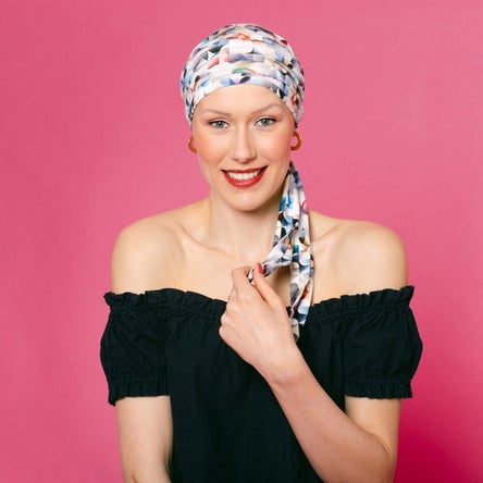 KOPFRAUSCH one - Durch die leichten und modischen Stoffe ist der Turban Lanea einfach zu binden und fühlt sich äusserst bequem an. Ideal für warme Tage bei Haarlosigkeit durch eine Autoimunerkrankung oder einer Chemo.