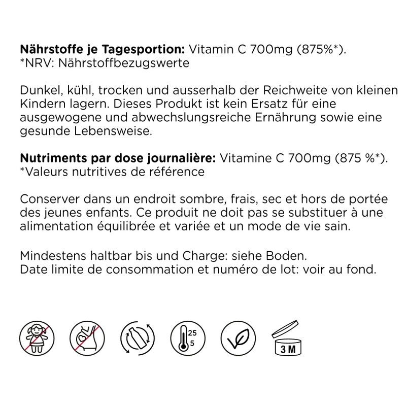 Eine Tagesportion liefert 700 mg Vitamin C, was 875 % des Nährstoffbezugswertes (NRV) entspricht. Vitamin C ist ein essenzieller Mikronährstoff, der zahlreiche Funktionen im Körper unterstützt und regelmäßig über die Ernährung oder Nahrungsergänzungsmittel zugeführt werden sollte.