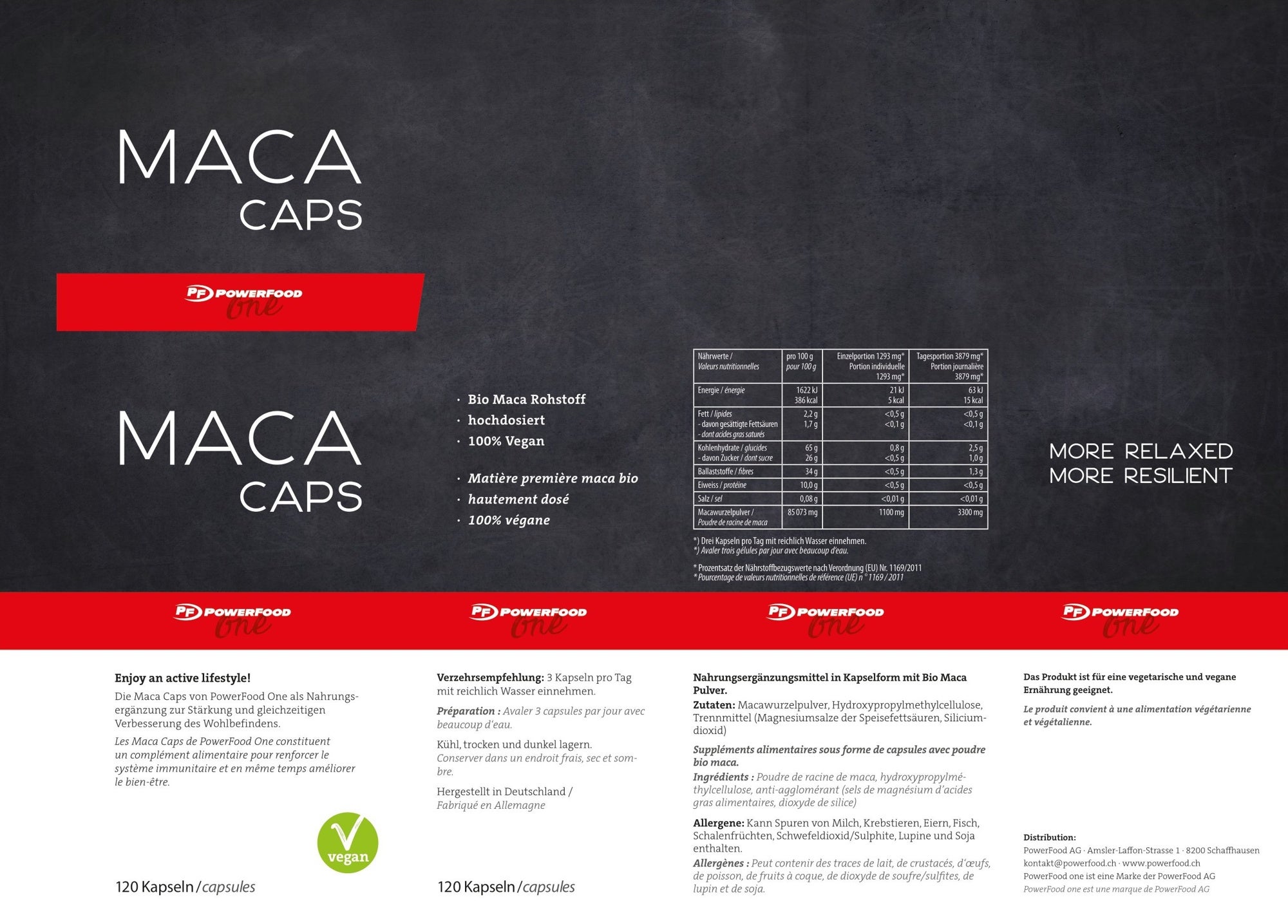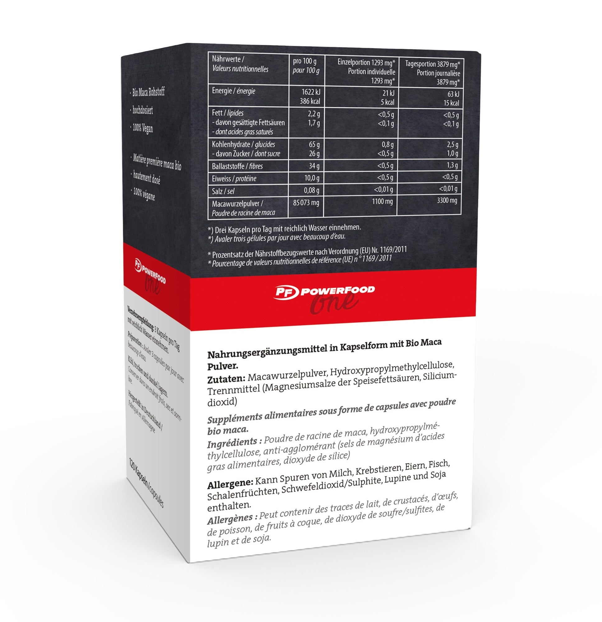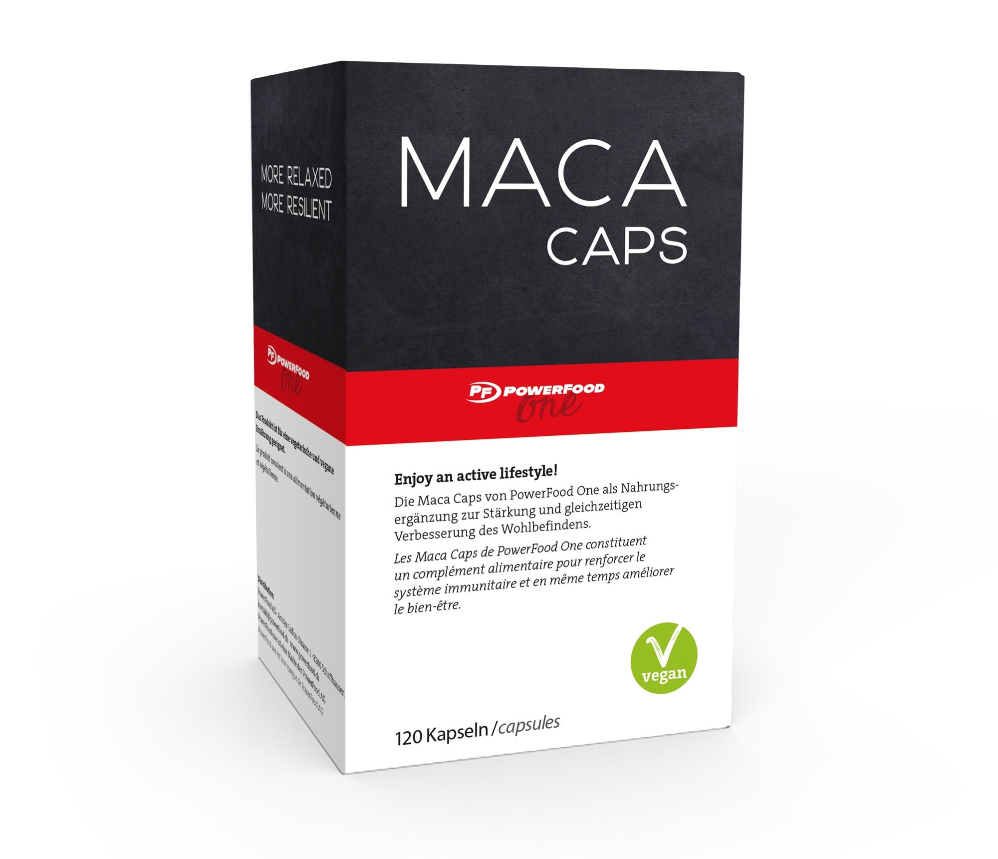Die neuen PowerFood One Maca Caps enthalten je Tagesdosierung von 3 Kapseln 3300mg Macawurzelpulver und können als Nahrungsergänzung zur Stärkung und gleichzeitigen Verbesserung des Wohlbefindens verwendet werden.