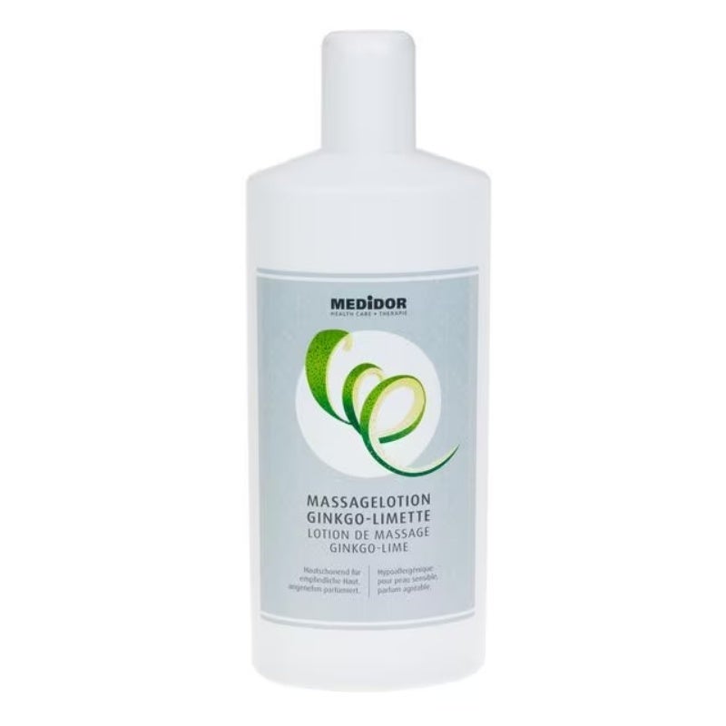 Die Massagelotion Ginkgo-Limette ist angenehm frisch parfümiert mit Ginkgo- und Limettenextrakten. Die Lotion ist für empfindliche Haut geeignet – sowohl von Patient als auch Therapeut.