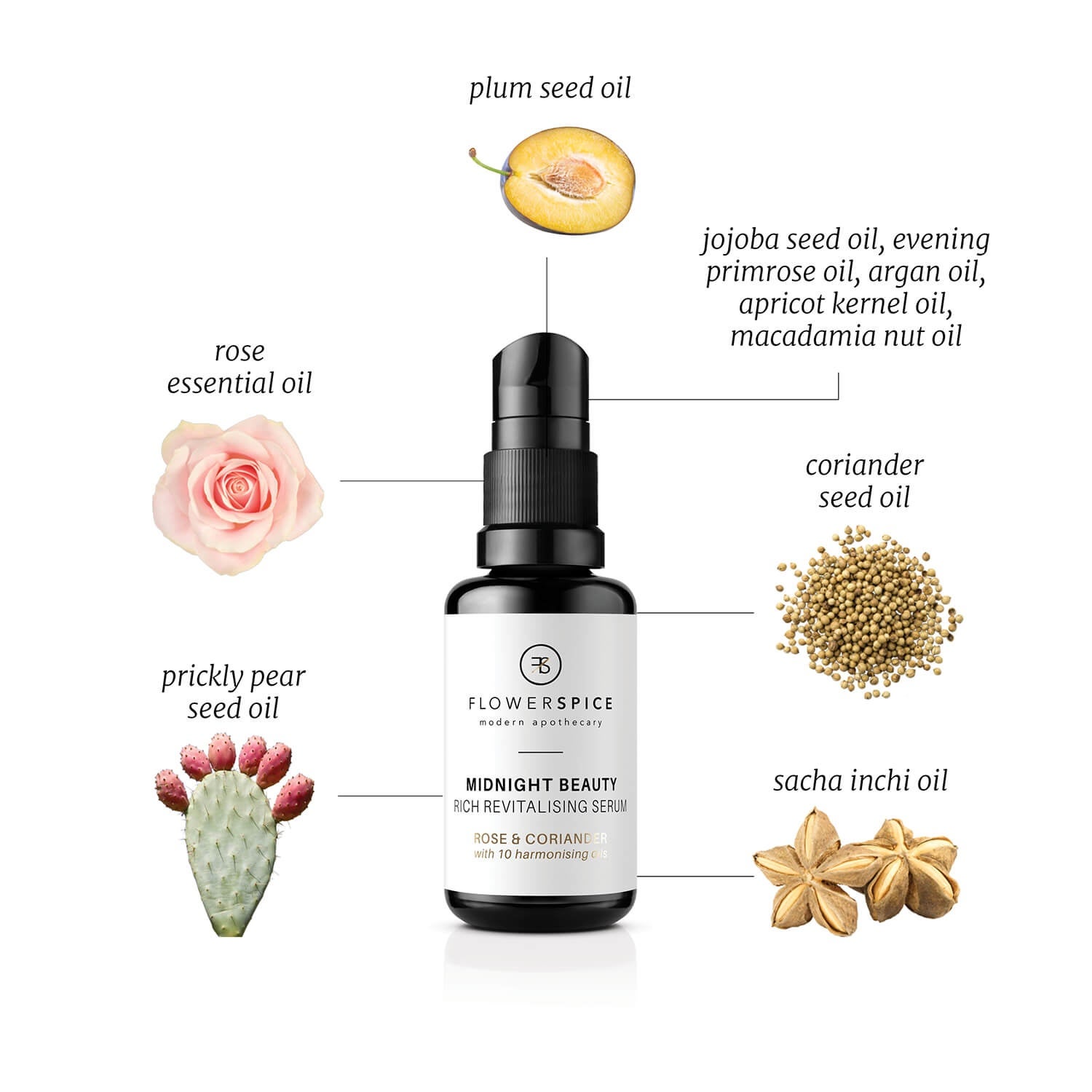 Für den ultimativen GLOW Effekt. Midnight Beauty ist der heilige Gral von FLOWER & SPICE. Diese kraftvolle Mischung aus 10 harmonisierenden Ölen zeigt sofortige Ergebnisse. Dieses luxuriöse Serum versorgt die Haut mit intensiver Feuchtigkeit, hellt Linien und Falten auf und hilft die natürliche Ölproduktion der Haut zu regulieren. Das Resultat ist ein ebenmässiges Hautbild und eine genährte, revitalisierte Haut. Verstärkt die Wirkung von Soothe & Repair. Powerfood für die Haut: 10 kraftvolle natürliche Öle (unter anderem Kaktusfeigenöl. Pflaumkernöl. Arganöl, Sacha Inchi, Nachtkerze und Macadamiaöl) sorgen für eine kraftvolle Wirkung bereits nach der 1. Nacht. Koriandersamenöl wirkt antibakteriell, antioxidativ und entzündungshemmend - hilft gegen Unreinheiten und harmonisiert das Hautbild. Reines Rosenöl fördert die Durchblutung der Haut und stärkt sie von innen. Der mild-blumige luxuriöse Duft wirkt während der Anwendung entspannend.