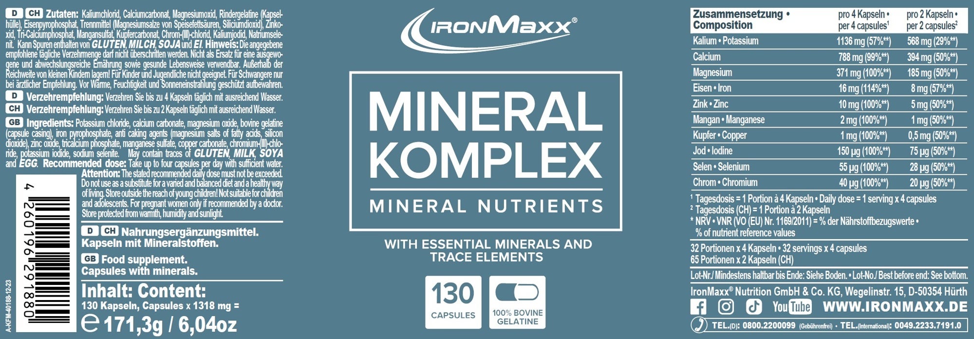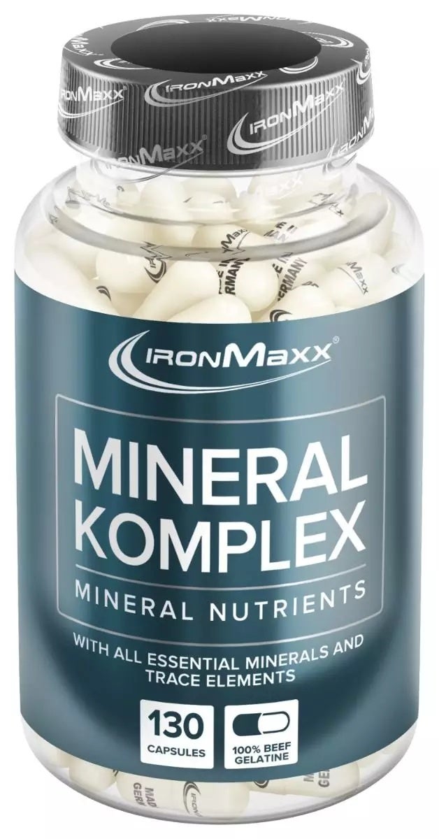 Versorgen Sie Ihren Körper mit ausreichend wichtigen Mineralien. Vier Kapseln IronMaxx® Mineralkomplex geben Ihnen 100%* der wichtigen Mineralien und Spurenelemente Calcium, Magnesium, Eisen, Zink, Mangan, Kupfer, Chrom, Jod und Selen.