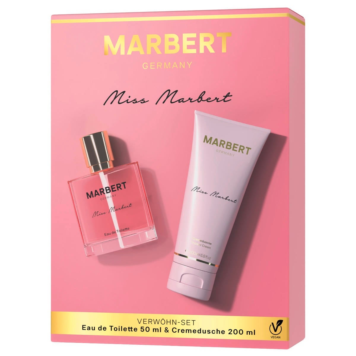 MISS MARBERT EAU DE TOILETTE: ALCOHOL DENAT., PARFUM, AQUA, BENZYL SALICYLATE, LINALYL ACETATE, LINALOOL, VANILLIN, DIETHYLHEXYL SYRINGYLIDENEMALONATE, DIMETHYL PHENETHYL ACETATE, CITRONELLOL, GERANYL ACETATE, ISOEUGENYL ACETATE, POGOSTEMON CABLIN OIL, GERANIOL, CANANGA ODORATA OIL/EXTRACT, CAPRYLIC/CAPRIC TRIGLYCERIDE, BENZYL BENZOATE, EUGENOL, HYDROXYCITRONELLAL, ROSE KETONES, BETA-CARYOPHYLLENE, ISOEUGENOL, BENZYL ALCOHOL, CITRUS AURANTIUM FLOWER OIL, LIMONENE, FARNESOL, CI 14700, CI 17200, PINENE. MISS MARBERT CREMEDUSCHE: AQUA, SODIUM LAURETH SULFATE, COCAMIDOPROPYL BETAINE, COCO-GLUCOSIDE, PARFUM, CITRIC ACID, SODIUM CHLORIDE, GLYCERYL OLEATE, GLYCOL DISTEARATE, SODIUM BENZOATE, SODIUM FORMATE, GUAR HYDROXYPROPYLTRIMONIUM CHLORIDE, POTASSIUM SORBATE, COCAMIDE MEA, BENZYL SALICYLATE, LAURETH-10, TETRASODIUM GLUTAMATE DIACETATE, LINALYL ACETATE, LINALOOL, VANILLIN, FORMIC ACID, DIMETHYL PHENETHYL ACETATE, CITRONELLOL.