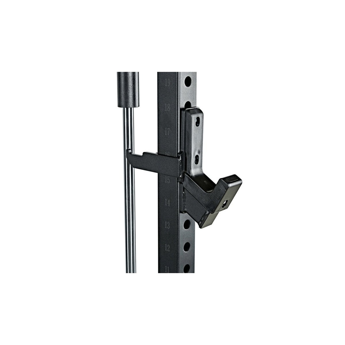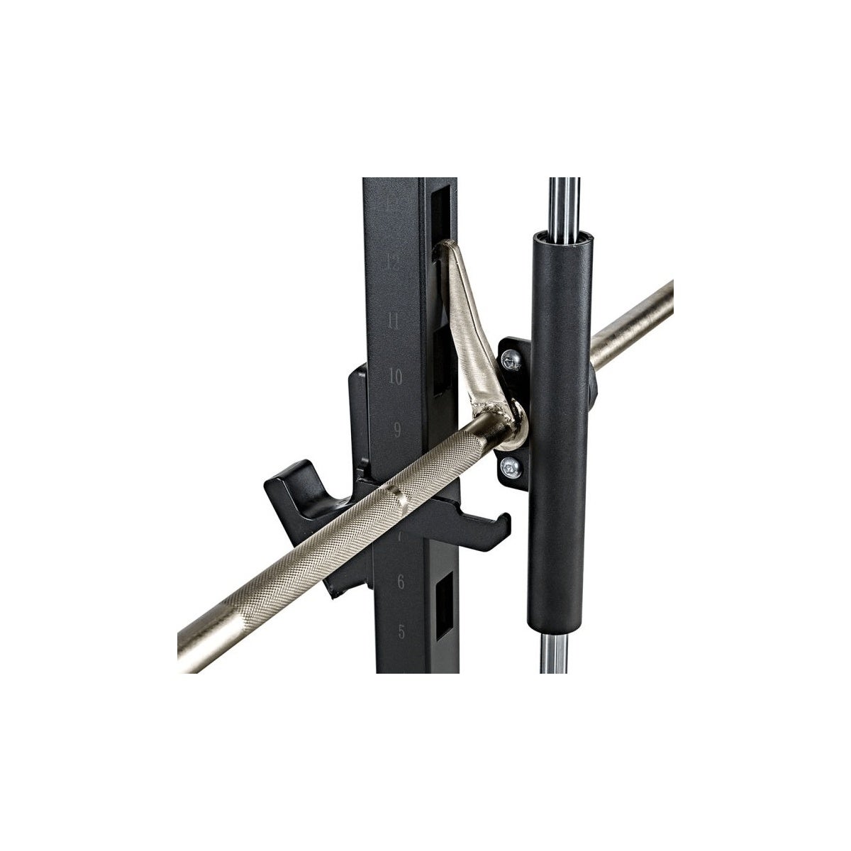 - Multipresse mit leicht und leise laufender Gleitlagerführung auf verchromten Ø 25 mm Vollstahlwellen, gerändelte Hantelstange mit Sicherheitsfanghaken zur Arretierung der Hantel in 10 verschiedenen Höhen, maximale Griffweite ca. 110 cm