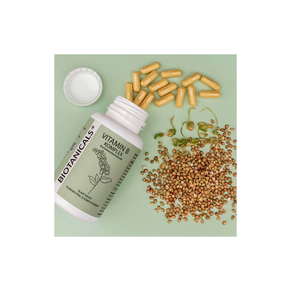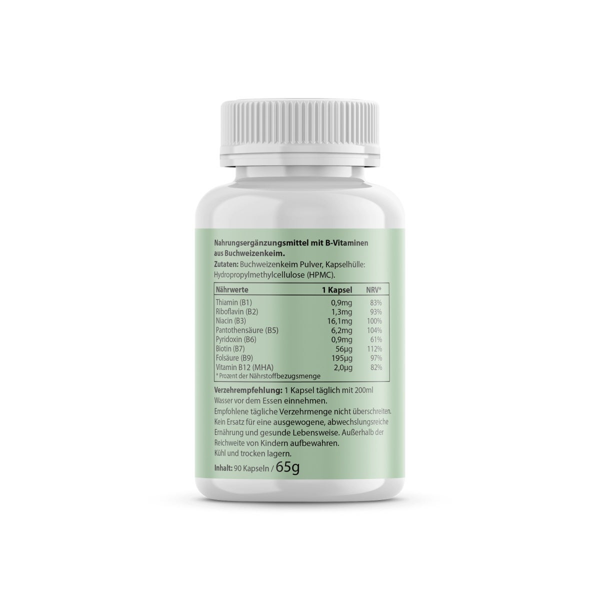 Das verwendete Buchweizenkeimpulver ist ein mit wertvollen B-Vitaminen aufgewerteter Buchweizenkeim. Neben einem hohen Anteil an B-Vitaminen wie B1, B2, B3, B5, B6, B12, Folsäure und Biotin sind auch – im Gegensatz zu chemisch-synthetisch hergestellten Präparaten - zahlreiche Mineralstoffe und Spurenelemente (darunter Eisen, Zink, Magnesium), Flavonoide und Coenzym Q10 im natürlichen Verbund des vitamingekeimten Buchweizens enthalten – eine einzigartige Synergie von optimaler Bioverfügbarkeit.