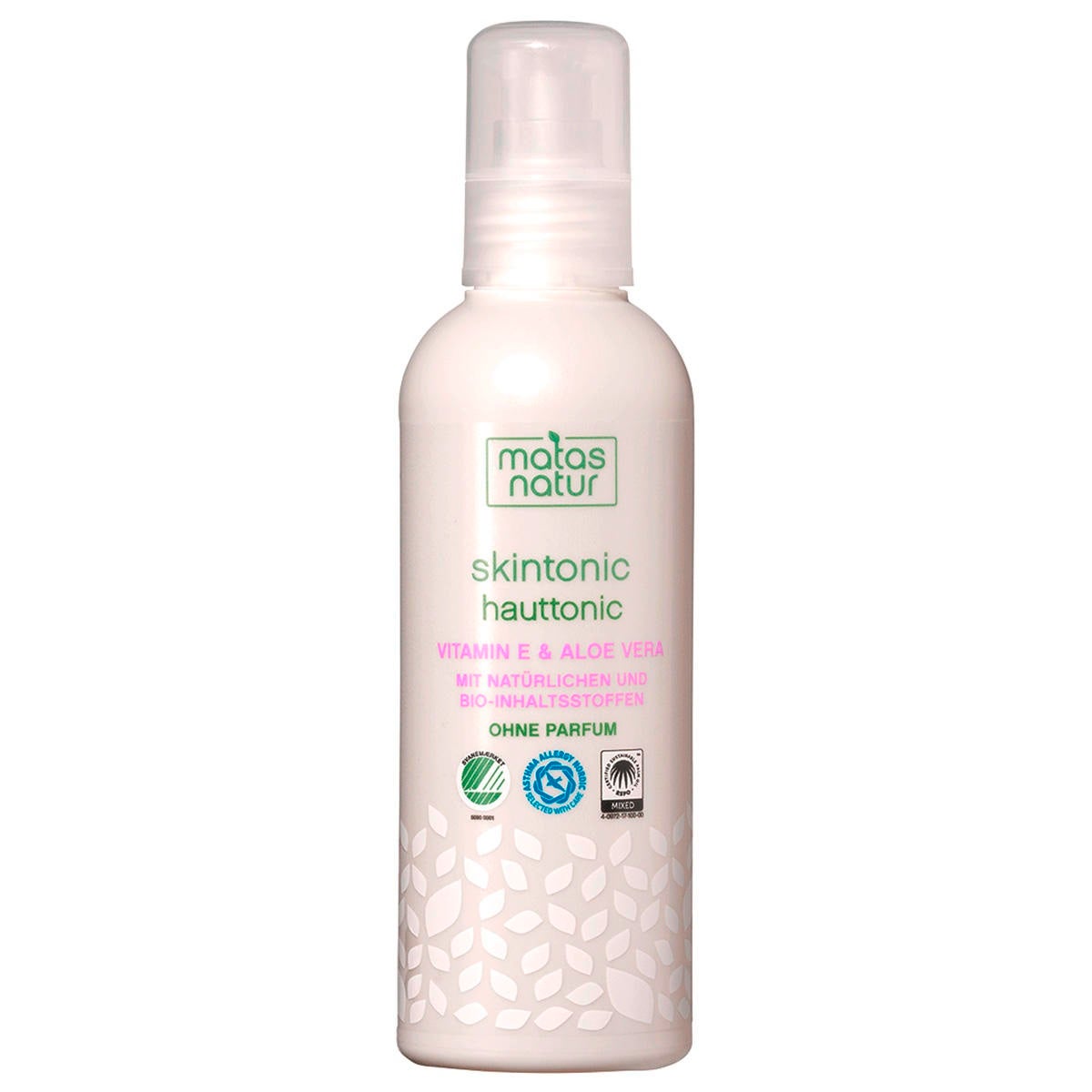 Mildes Gesichtswasser mit reinigender Wirkung - befreit die Haut, ohne sie auszutrocknen. Matas Natur Hauttonic ohne Parfum. Das milde Gesichtswasser mit reinigender Wirkung befreit die Haut von Verschmutzungen, ohne sie auszutrocknen. Bio-Aloe Vera schützt, pflegt und führt der Haut Feuchtigkeit zu. Das Tonic hinterlässt ein frisches, sauberes Gefühl. Für jeden Hauttyp geeignet - speziell für sensitive, empfindliche Haut. Anwendung: 1 Pumphub auf ein Wattepad geben und die Haut sanft reinigen. Täglich benutzen, um Hautunreinheiten zu reduzieren.