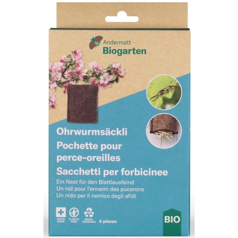Die nacht- und dämmerungsaktiven Ohrwürmer haben einen vielseitigen Speisezettel. Sie ernähren sich von Blattläusen, Apfelwicklereiern, anderen kleinen Insekten und im Spätherbst sogar von Schneckeneiern. Tagsüber benötigen sie ein geschütztes Versteck, das idealerweise in der Nähe von Blattlauskolonien oder anderer Nahrungsquellen platziert wird. Die beiliegenden Drähte ermöglichen eine einfache Befestigung an Ästen oder Stämmen. Sind die Blattläuse an einem Standort weitgehend verschwunden, können Sie die besiedelten Säckli problemlos an andere Pflanzen umhängen.