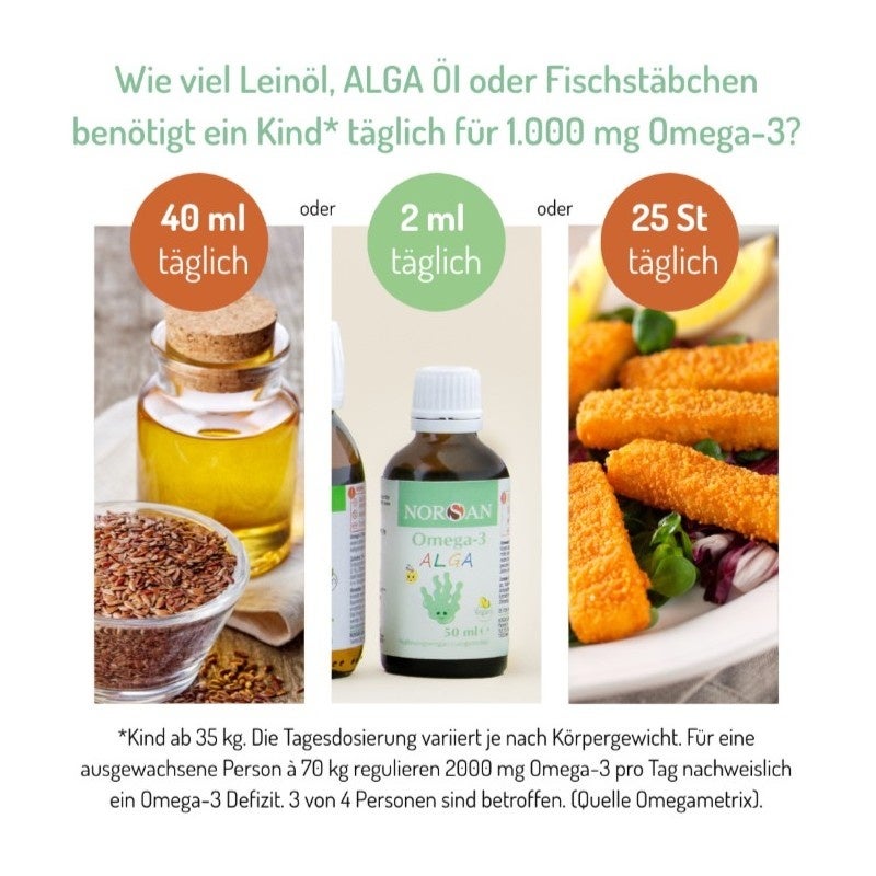 Das NORSAN Omega-3 ALGA enthält ein pflanzliches Algenöl, welches reich an der marinen Omega-3-Fettsäure DHA ist. Es wurde besonders auf die Bedürfnisse von Kindern abgestimmt und ist dank des kindgerechten Dosierlöffels leicht zu dosieren. Die empfohlene Tagesdosis (bspw. 2 ml bei 35 kg) enthält 1.000 mg Omega-3.
