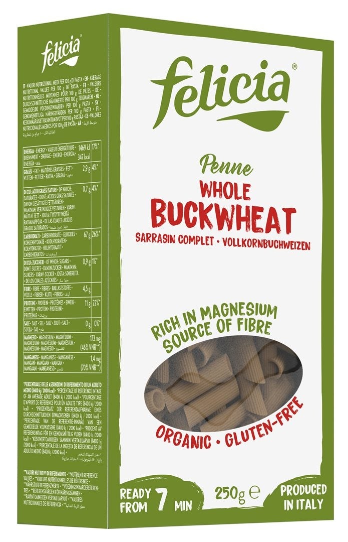 Die felicia Buchweizen Penne bestehen zu 100% aus hochwertigem Buchweizenmehl und sind eine besonders schmackhafte, glutenfreie Alternative zu herkömmlicher Pasta. Durch ihren kräftigen, leicht nussigen Geschmack bringen sie Abwechslung in die Küche und bieten eine gute Basis für kreative Pastagerichte. Dank der klassischen Röhrenform nehmen sie Saucen hervorragend auf und garantieren ein vollmundiges Genusserlebnis. Mit einer Kochzeit von 7 Minuten sind sie zudem schnell zubereitet und praktisch im Alltag.