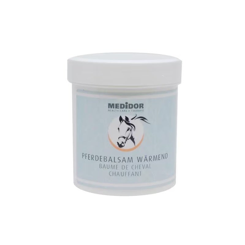 Der wärmende Pferdebalsam ist ein pflegendes und regenerierendes Kosmetikum. Er dient zur unterstützenden Pflege bei Muskelkater, Rückenverspannungen, Gelenkbeschwerden und müden Muskeln. Angereichert mit wertvollen Kräuterextrakte von rotem Weinlaub, Rosskastanie, Melisse, Kamille, Hopfen, Baldrian, Schafgarbe und Fenchel. Der Pferdebalsam kombiniert die entspannende Wirkung der Essenzen mit der positiven Wirkung der Kräuterextrakte. Der ausgewogene Gehalt an aktiven Wirkstoffen sorgt für eine breite und starke Wirkung. Die wärmende Version des Pferdebalsams wirkt als effektives präventives Mittel zur Erwärmung des Bewegungsapparates. Er eignet sich für alle Altersgruppen.