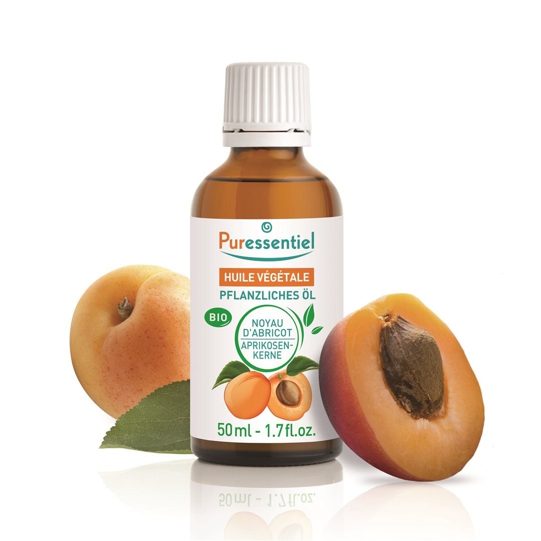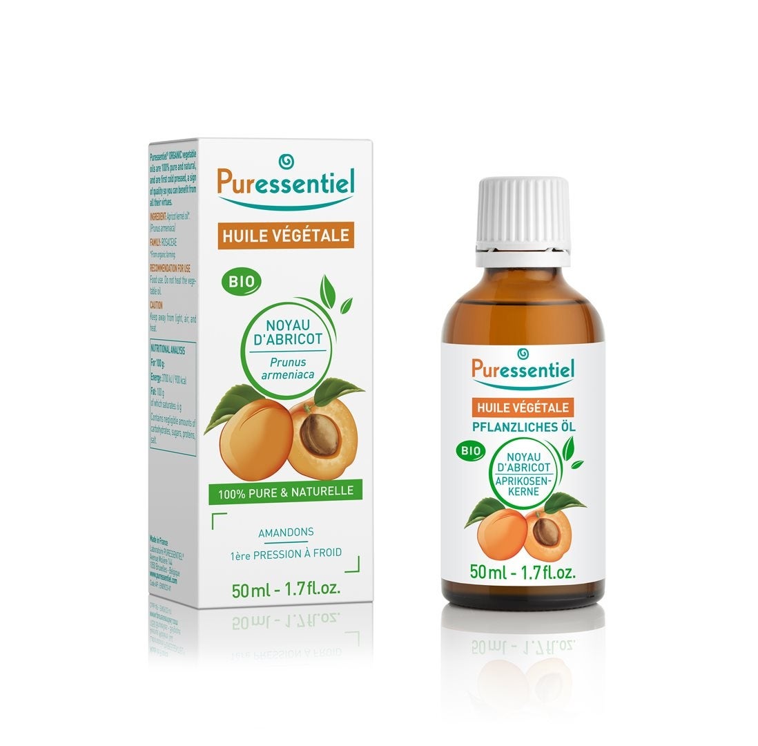 Aprikosenkern-Bio-Pflanzenöl von Puressentiel, das aus biologischem Landbau stammt und zu 100% rein und natürlich ist, wird durch Kaltpressen gewonnen.