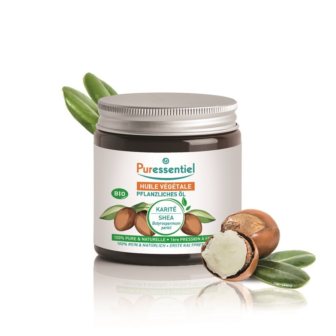 Pflanzenöl für Haut und Haar. Die durch erste Kaltpressung gewonnene BIO Puressentiel Sheabutter ist 100% roh, rein und natürlich. Nährend, regenerierend und beruhigend, Sheabutter ist die ideale Pflege, um Haut und Haar tiefgreifend zu nähren und zu reparieren.