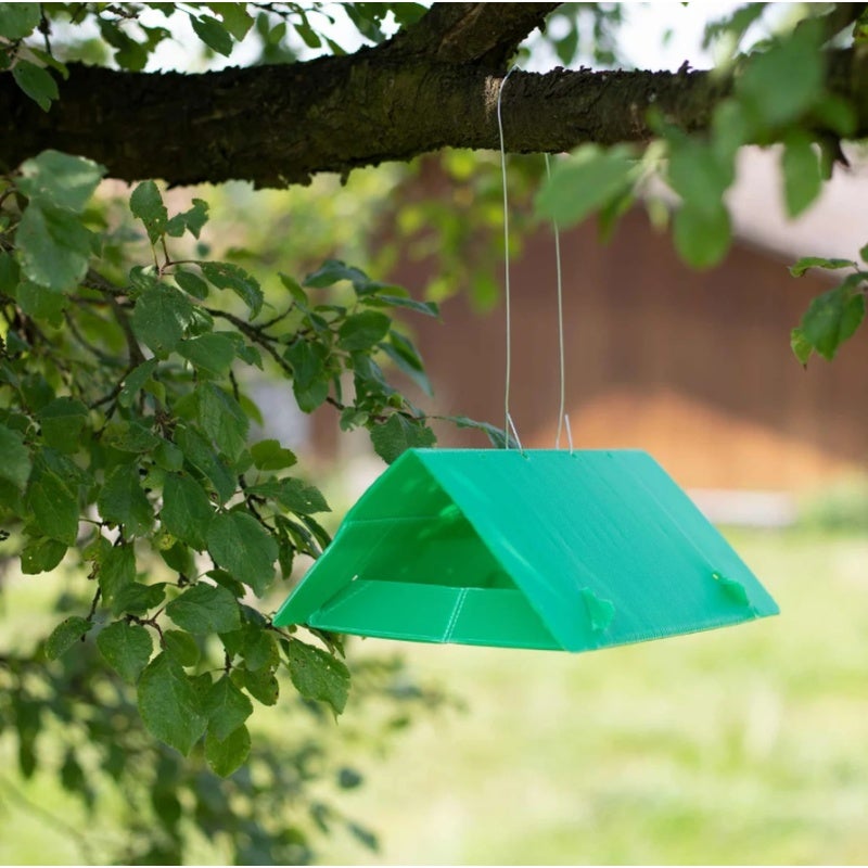 Die Falle dient zur zuverlässigen Überwachung der Flugzeit sowie zur deutlichen Reduktion des Pflaumenwicklerfalters (Grapholita funebrana). Dessen Larven bohren sich in Zwetschgen, Pflaumen und Mirabellen und verursachen die typische Wurmstichigkeit. Das Pflaumenwickler-Fallen-Set enthält eine funktionsbereite Falle, die passende Aufhängung, Lockstoffe sowie Leimböden. Diese Komponenten sind optimal aufeinander abgestimmt und erleichtern den Einsatz im Obstgarten erheblich. Lockstoff und Leimböden können bei Bedarf auch separat als «Pflaumenwickler-Lockstoff» nachgekauft werden. Pro 250qm oder – bei grösserem Pflanzabstand – 1 Falle pro Baum sollte aufgehängt werden, idealerweise im oberen Kronenbereich.