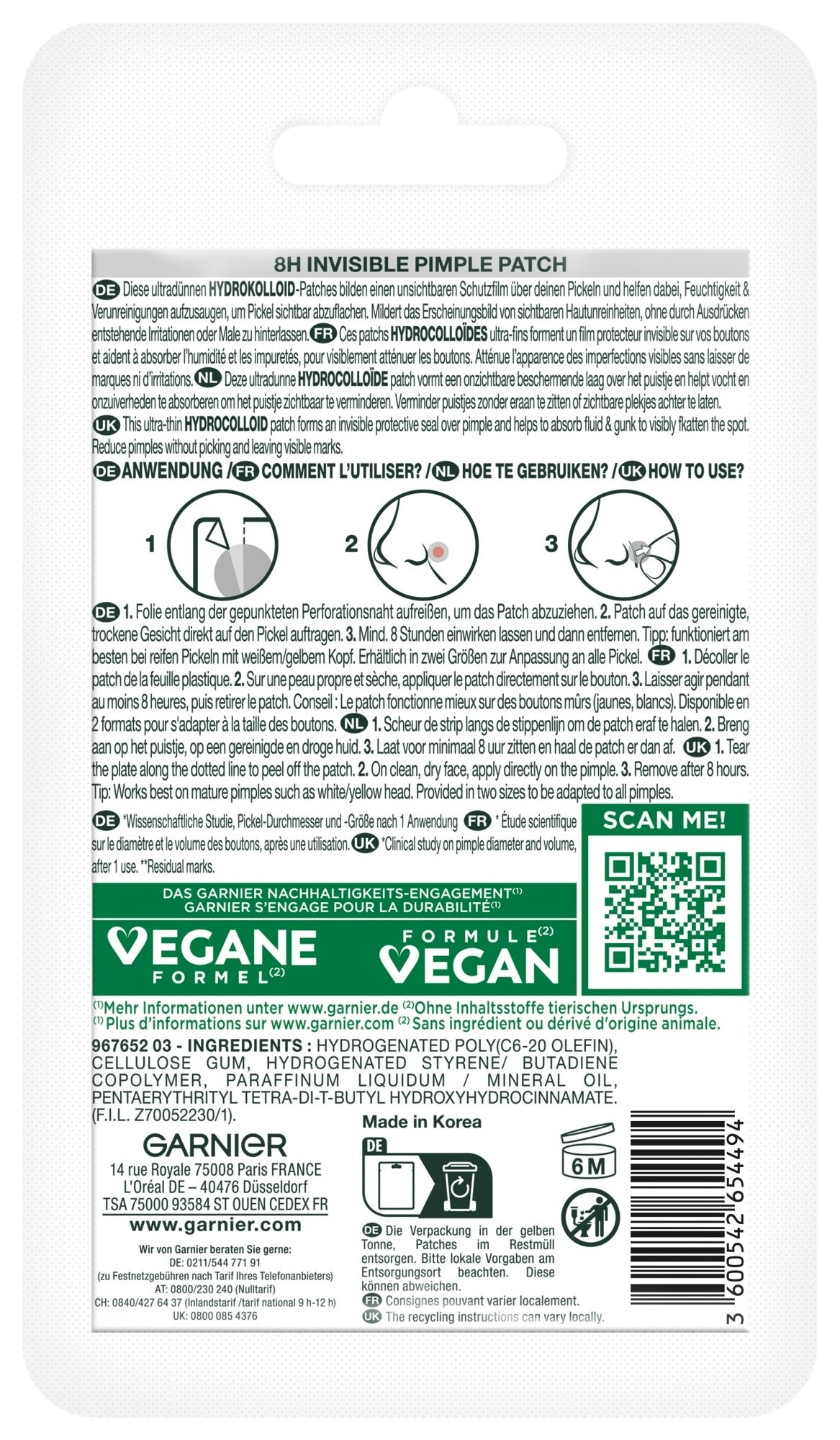 Die Garnier Hautklar 8H Pimple Patches entfernen Pickel, ohne dass ein Ausdrücken notwendig ist. Sie bilden einen unsichtbaren Schutzfilm über den Pickeln und das enthaltende Hydrokolloid sorgt dafür, dass Feuchtigkeit und Verunreinigungen aus der Haut aufgesogen werden. So helfen die Pickel-Patches dabei, Pickel sichtbar abzuflachen, Hautunreinheiten im Gesicht zu mildern und Pickel über Nacht in nur 8 Stunden loszuwerden. Kein Pickel ausdrücken – keine Pickelmale. Die Hydrokolloid-Pflaster gibt es in zwei Grössen, um sie individuell an die Grösse der Pickel anzupassen. Zudem ist die Formel der Garnier Pimple Patches vegan und wissenschaftlich bestätigt.