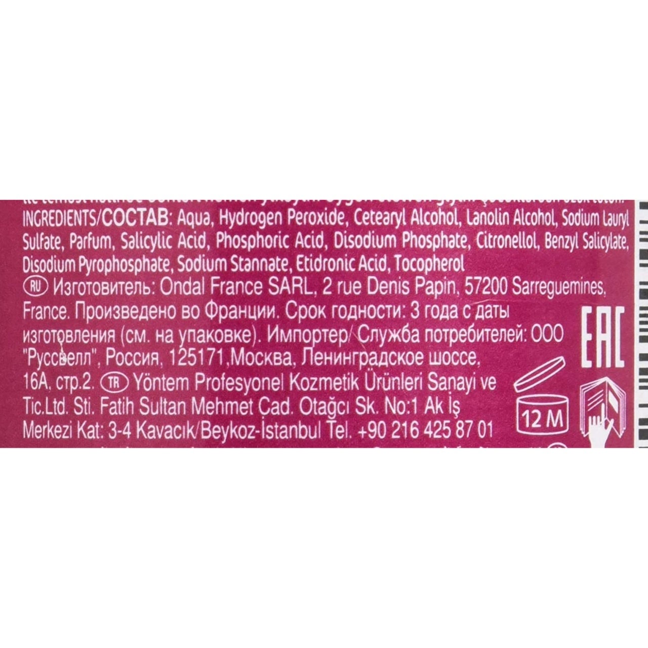 Aqua / Hydrogen Peroxide / Cetearyl Alcohol / Lanolin Alcohol / Sodium Lauryl Sulfate/ Parfum / Salicylic Acid / Phosphoric Acid / Disodium Phosphate / Linalool / Hexyl Cinnamal / Etidronic Acid / Tocopherol