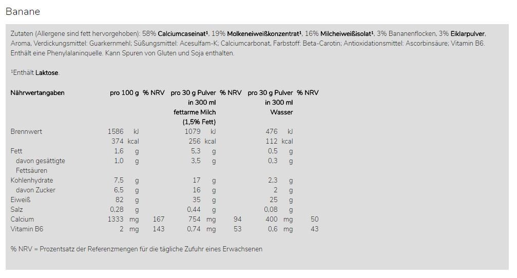 Banane: 58% Calciumcaseinat¹, 19% Molkeneiweißkonzentrat¹, 16% Milcheiweißisolat¹, 3% Bananenflocken, 3% Eiklarpulver, Aroma, Verdickungsmittel: Guarkernmehl; Süßungsmittel: Acesulfam-K; Calciumcarbonat, Farbstoff: Beta-Carotin; Antioxidationsmittel: Ascorbinsäure; Vitamin B6. Enthält eine Phenylalaninquelle.