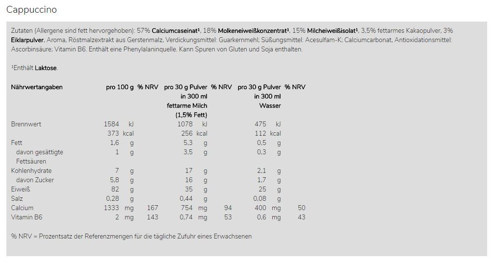 Cappuccino: 57% Calciumcaseinat¹, 18% Molkeneiweißkonzentrat¹, 15% Milcheiweißisolat¹, 3,5% fettarmes Kakaopulver, 3% Eiklarpulver, Aroma, Röstmalzextrakt aus Gerstenmalz, Verdickungsmittel: Guarkernmehl; Süßungsmittel: Acesulfam-K; Calciumcarbonat, Antioxidationsmittel: Ascorbinsäure; Vitamin B6. Enthält eine Phenylalaninquelle.