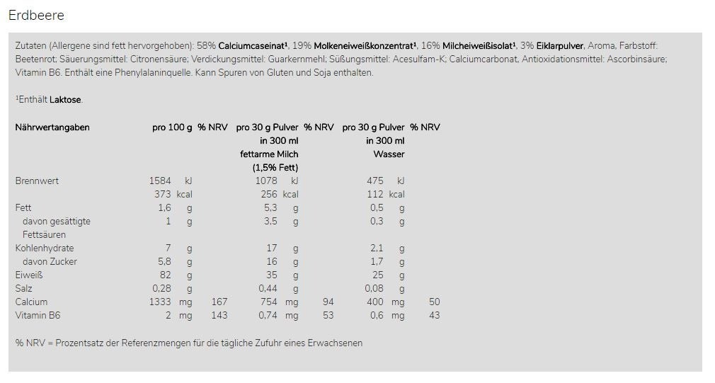 Erdbeere: 58% Calciumcaseinat¹, 19% Molkeneiweißkonzentrat¹, 16% Milcheiweißisolat¹, 3% Eiklarpulver, Aroma, Farbstoff: Beetenrot; Säuerungsmittel: Citronensäure; Verdickungsmittel: Guarkernmehl; Süßungsmittel: Acesulfam-K; Calciumcarbonat, Antioxidationsmittel: Ascorbinsäure; Vitamin B6. Enthält eine Phenylalaninquelle