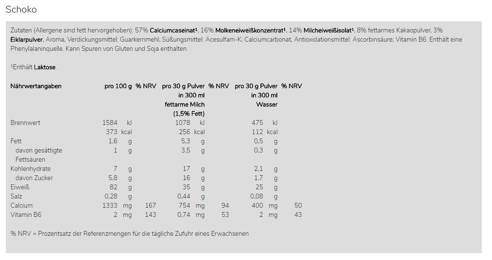 Schoko: 57% Calciumcaseinat¹, 16% Molkeneiweißkonzentrat¹, 14% Milcheiweißisolat¹, 8% fettarmes Kakaopulver, 3% Eiklarpulver, Aroma, Verdickungsmittel: Guarkernmehl; Süßungsmittel: Acesulfam-K; Calciumcarbonat, Antioxidationsmittel: Ascorbinsäure; Vitamin B6. Enthält eine Phenylalaninquelle.