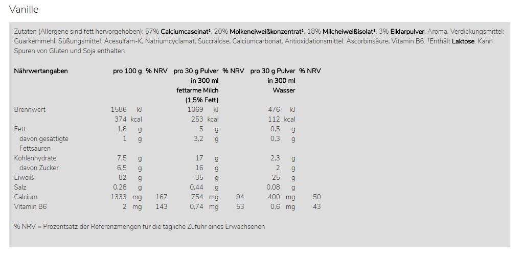 Vanille: 57% Calciumcaseinat¹, 20% Molkeneiweißkonzentrat¹, 18% Milcheiweißisolat¹, 3% Eiklarpulver, Aroma, Verdickungsmittel: Guarkernmehl; Süßungsmittel: Acesulfam-K, Natriumcyclamat, Succralose; Calciumcarbonat, Antioxidationsmittel: Ascorbinsäure; Vitamin B6
