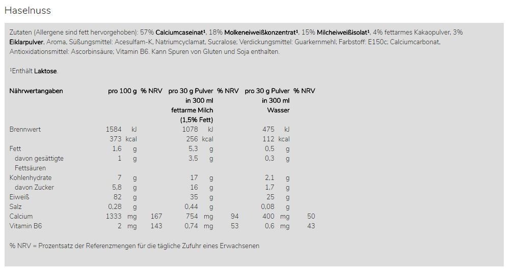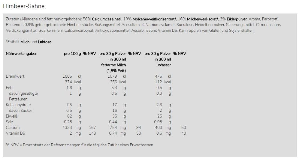 Himbeer-Sahne: 56% Calciumcaseinat¹, 19% Molkeneiweißkonzentrat¹, 16% Milcheiweißisolat¹, 3% Eiklarpulver, Aroma, Farbstoff: Beetenrot; 0,9% gefriergetrocknete Himbeerstücke, Süßungsmittel: Acesulfam-K, Natriumcyclamat, Sucralose; Heidelbeerpulver, Säuerungsmittel: Citronensäure; Verdickungsmittel: Guarkernmehl; Calciumcarbonat, Antioxidationsmittel: Ascorbinsäure; Vitamin B6.