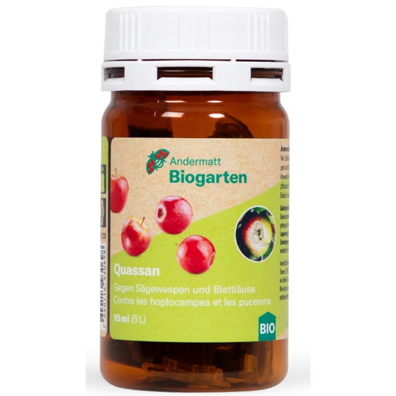 Von Apfel- und Pflaumensägewespenlarven befallene Früchte sind typischerweise teilweise ausgehöhlt, mit feuchtem, unangenehm riechendem Kot gefüllt und zeigen oftmals austretende Rückstände aus den Einbohrlöchern. Betroffene Früchte fallen meist frühzeitig ab und beeinträchtigen damit die Ernte deutlich. Quassan, ein biologisches Produkt aus Bitterholzextrakt (Quassia amara), bietet eine wirksame Behandlung gegen Sägewespen und zeigt bei Anwendung unmittelbar nach der Blüte zusätzlich eine Teilwirkung gegen Blattläuse. Das Mittel eignet sich besonders für Obstgärten, in denen häufiger Befall vorkommt, und trägt zu einer gesünderen Fruchtentwicklung bei.