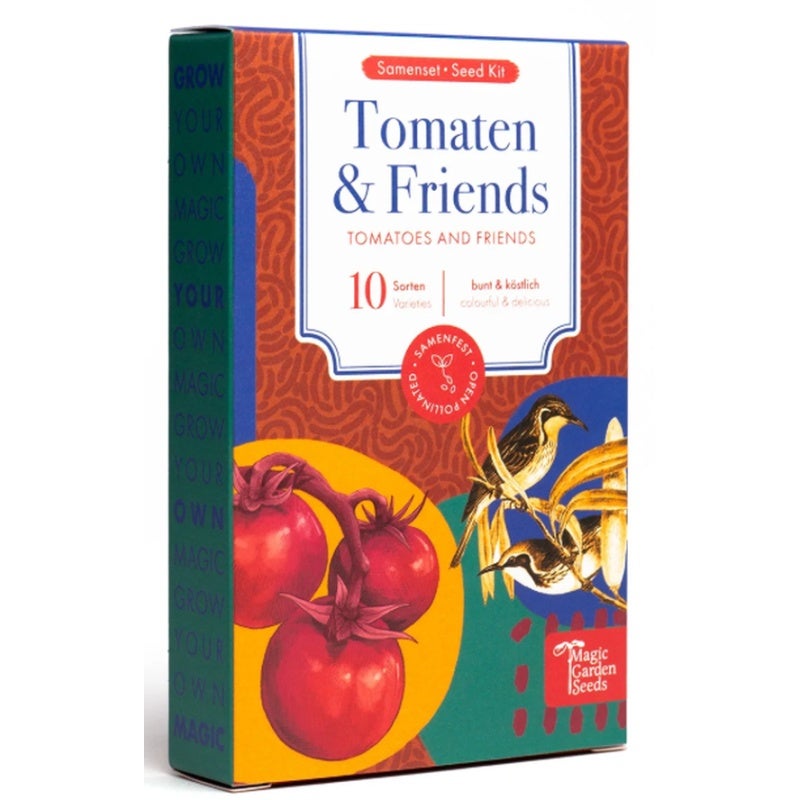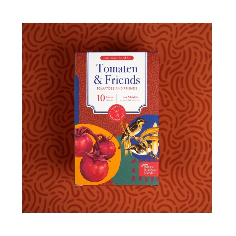 HVerwandeln Sie Ihren Garten oder Balkon in ein wahres Paradies für Feinschmecker! Dieses hocheffiziente Einsteiger-Set von Magic Garden Seeds vereint 10 sorgfältig ausgewählte, samenfeste Sorten, die für eine bunte und köstliche Ernte sorgen. Mit sieben aussergewöhnlichen Tomatenvarietäten – von der milden "Goldenen Königin" bis zum aromatischen "Black Prince" – und drei passenden Kräuter-Partnern wie Basilikum und Rucola ist dieses Set perfekt aufeinander abgestimmt.