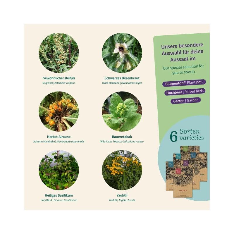 Tauchen Sie ein in die faszinierende Welt der Ethnobotanik und hocheffizienten Gartenkunst! Dieses besondere Samenset von Magic Garden Seeds enthält eine Auswahl an sagenumwobenen Pflanzen, die seit Jahrhunderten für Rituale und Räucherwerke verwendet werden. Von der geheimnisvollen Alraune bis hin zum reinigenden Beifuss bietet diese Kollektion alles, um Ihren Garten in einen Ort voller Mystik und zu 100% natürlicher Düfte zu verwandeln.