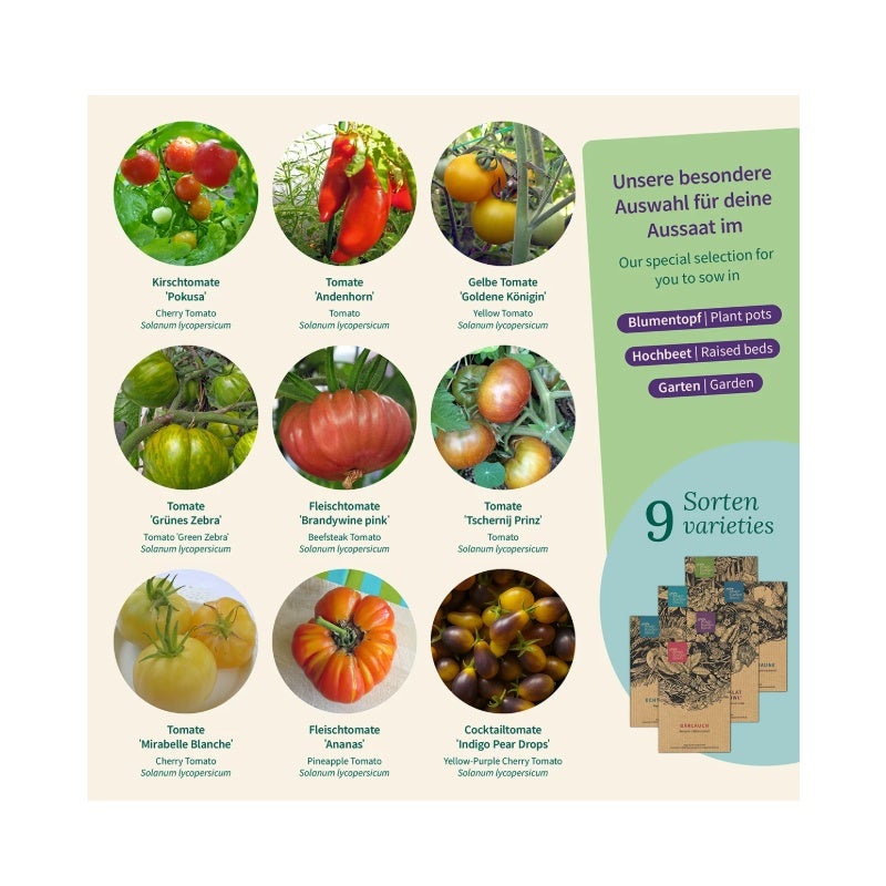 Ein entscheidender Vorteil dieser Auswahl ist die Kombination aus aussergewöhnlicher Ästhetik und robustem Wachstum. Da alle enthaltenen Sorten samenfest sind, können Sie die Samen Ihrer Lieblingsfrüchte einfach selbst ernten und im nächsten Jahr erneut aussäen. Ob für den direkten Verzehr, als farbliches Highlight im Salat oder für aromatische Saucen – dieses Set ist der perfekte Einstieg für alle, die das Besondere suchen und Wert auf Sortenvielfalt im eigenen Garten legen.