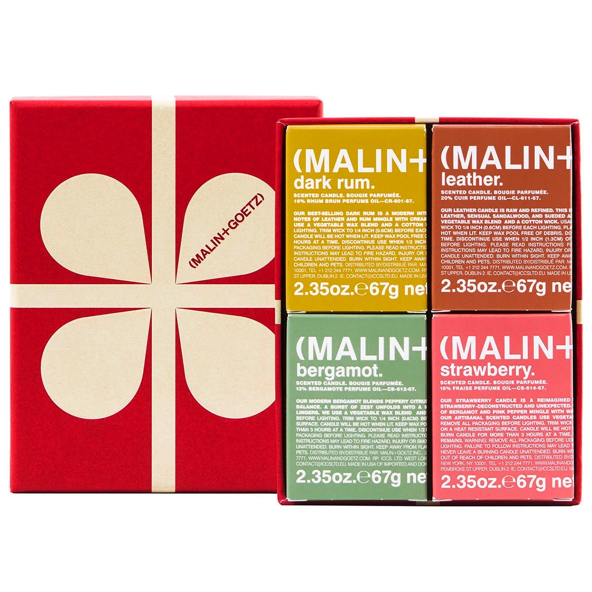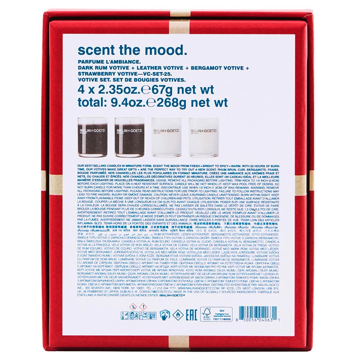 Vier dynamische Düfte für Ihr Zuhause als Votivkerzen. Genießen Sie die meistverkauften Kerzen von MALIN+GOETZ: Leder, Dunkler Rum, Bergamotte + Otto in Miniaturform. Inspiriert von schönsten Erinnerungen und einzigartigen Elementen der Natur, erfüllen diese lebendigen Aromen Ihr Zuhause mit Gefühlen der Freude und Nostalgie. Die Kerzen von MALIN+GOETZ bestehen aus einer natürlichen Wachsmischung, die sauber und langsam abbrennt und eine Brenndauer von 25 Stunden hat. MALIN+GOETZ Scent The Mood Candle Set beinhaltet: