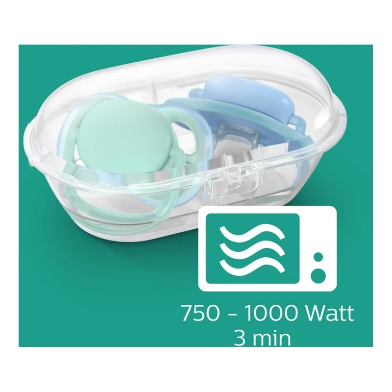 Den Schnuller immer in der Größe wählen, die dem aktuellen Kindesalter entspricht. Das Reiseetui Ultra Air dient auch als Sterilisator. Wasser in die Box einfüllen und sie für ein paar Minuten in eine Mikrowelle geben. So können Sie sicher sein, dass der Schnuller sauber und einsatzbereit ist.