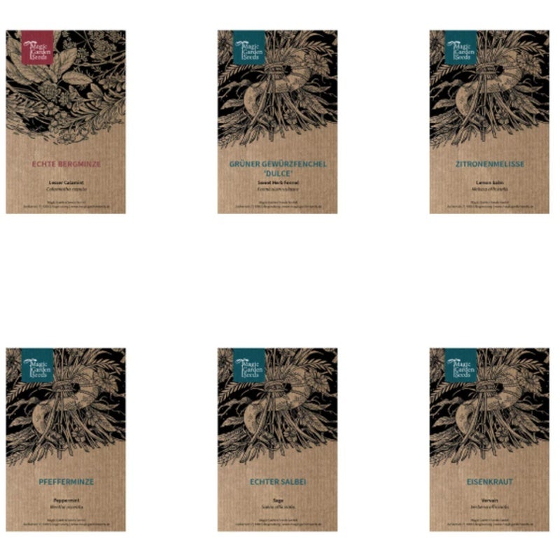 Dieses Samenset enthält sechs klassische Tee-Kräuter für den Heimanbau: Pfefferminze, Zitronenmelisse, echter Salbei, Bergminze, Eisenkraut und grüner Gewürzfenchel "Dulce". Pfefferminze und Bergminze sorgen für frische, aromatische Tees, Zitronenmelisse besticht mit ihrem charakteristischen Duft, während echter Salbei eine wertvolle traditionelle Heil- und Würzpflanze darstellt. Eisenkraut rundet das Set als alte Heilpflanze ab, und der Gewürzfenchel liefert süssaromatische Samen für aromatischen Fencheltee.