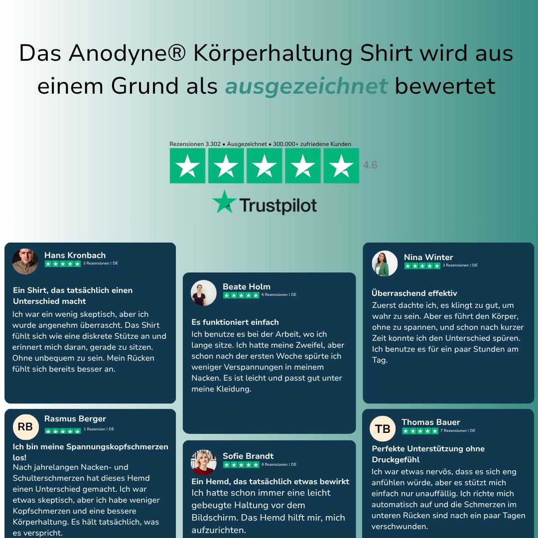 Erwischen auch Sie bei langen Stunden im Büro immer wieder in einer schlechten Haltung und fällt es Ihnen schwer, sich stets an eine gerade Körperhaltung zu erinnern? Wünschen Sie sich eine bequeme Lösung, die Ihre Haltung mühelos verbessert und sich optimal an Ihren Lebensstil anpasst? Dann ist das Anodyne® Shirt genau das Richtige für Sie - ein revolutionäres T-Shirt, das die Art und Weise, wie Sie Ihre täglichen Aktivitäten angehen, verändern wird.
