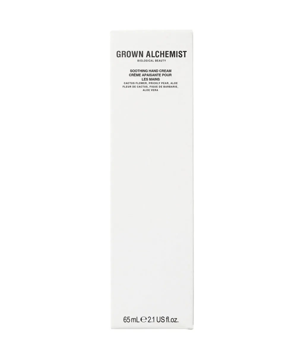 Die Grown Alchemist Soothing Hand Cream ist eine leichte Creme, die empfindliche Hände mit beruhigenden Inhaltsstoffen versorgt. Pflanzliche Extrakte wie Aloe und Kaktusblüte spenden intensiv Feuchtigkeit und stärken die Hautbarriere und unterstützen die natürliche Hautbarriere. Die Grown Alchemist Handcreme zieht rasch ein und hinterlässt bei jedem Händewaschen ein geschmeidiges Hautgefühl. Für gepflegte Hände und eine wohltuende, von der Kraft der Pflanzen inspirierte Pflege.
