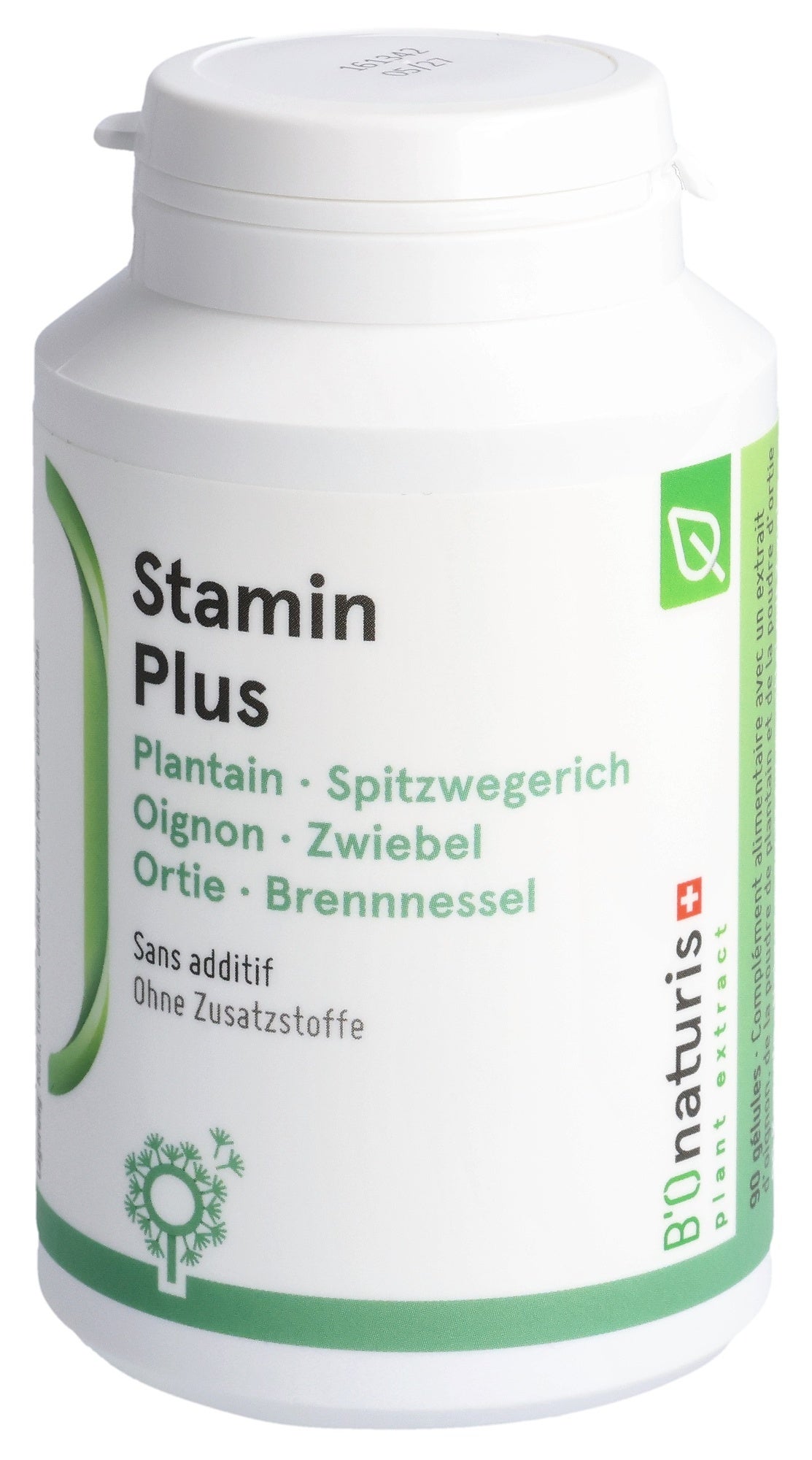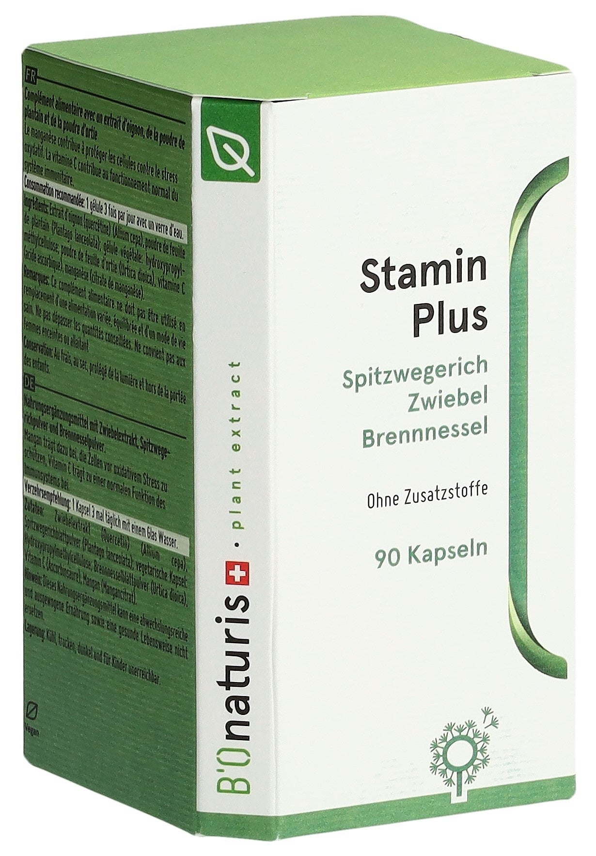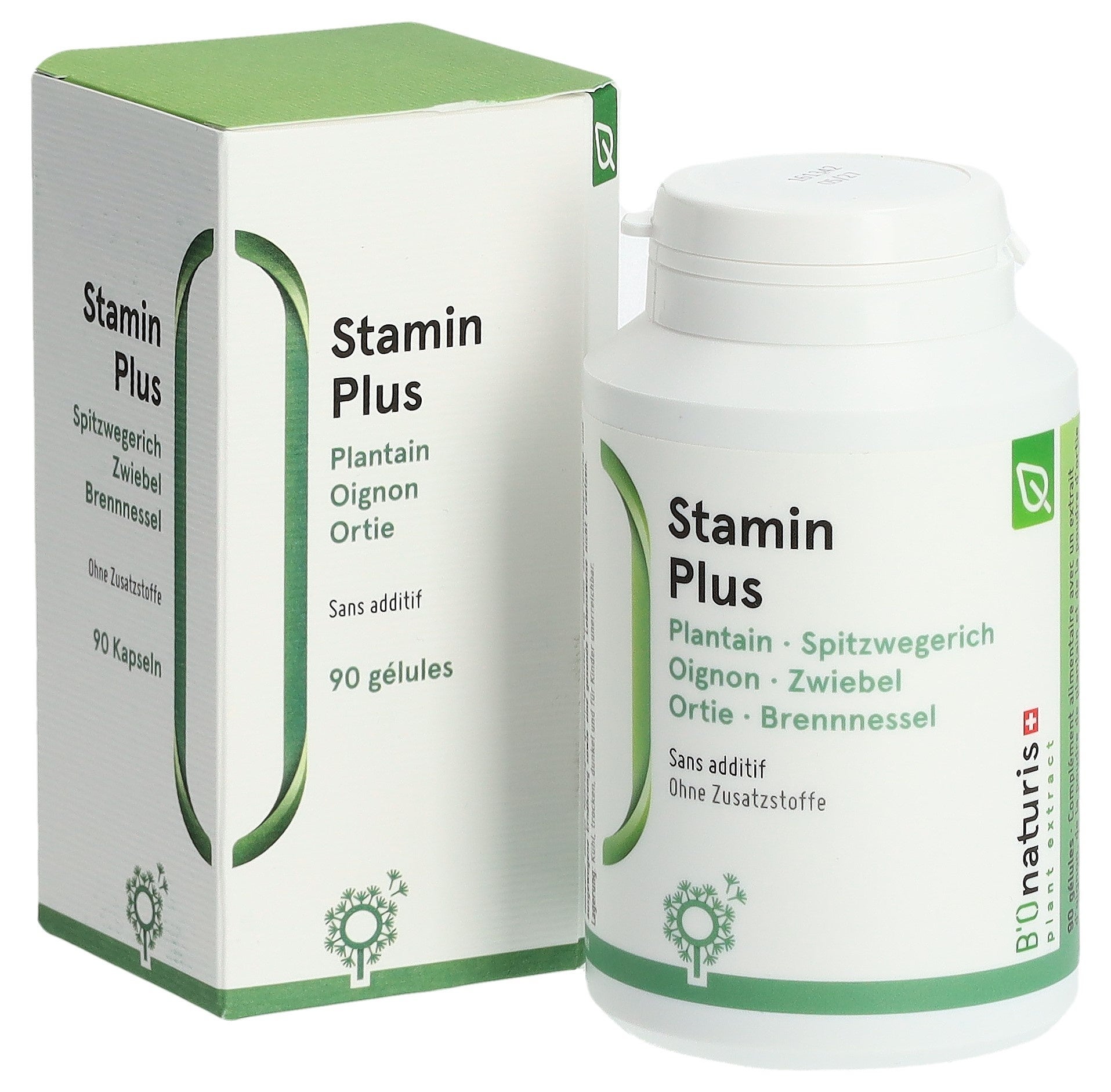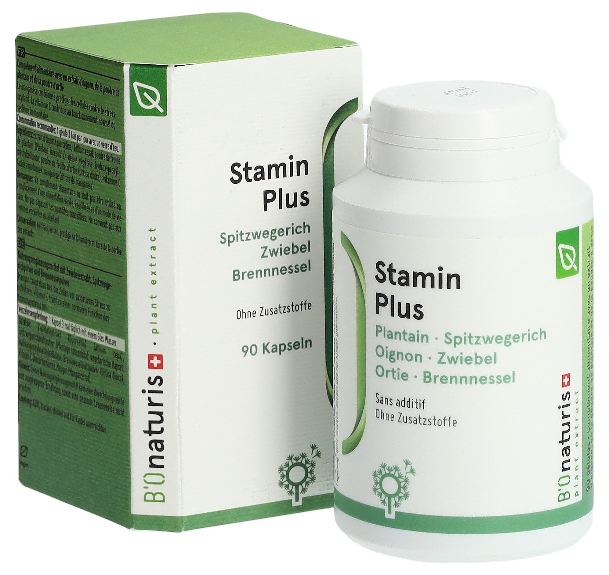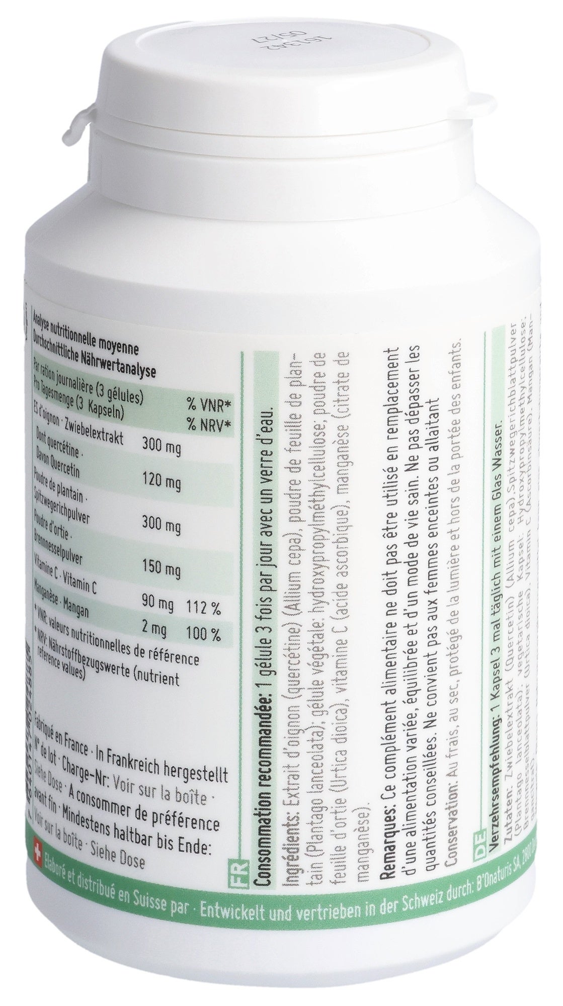 Zwiebelextrakt (Quercetin) (Allium cepa), Spitzwegerichblattpulver (Plantago lanceolata), vegetarische Kapsel: Hydroxypropylmethylcellulose, Brennnesselblattpulver (Urtica dioica), Vitamin C (Ascorbinsäure), Mangan (Mangancitrat).