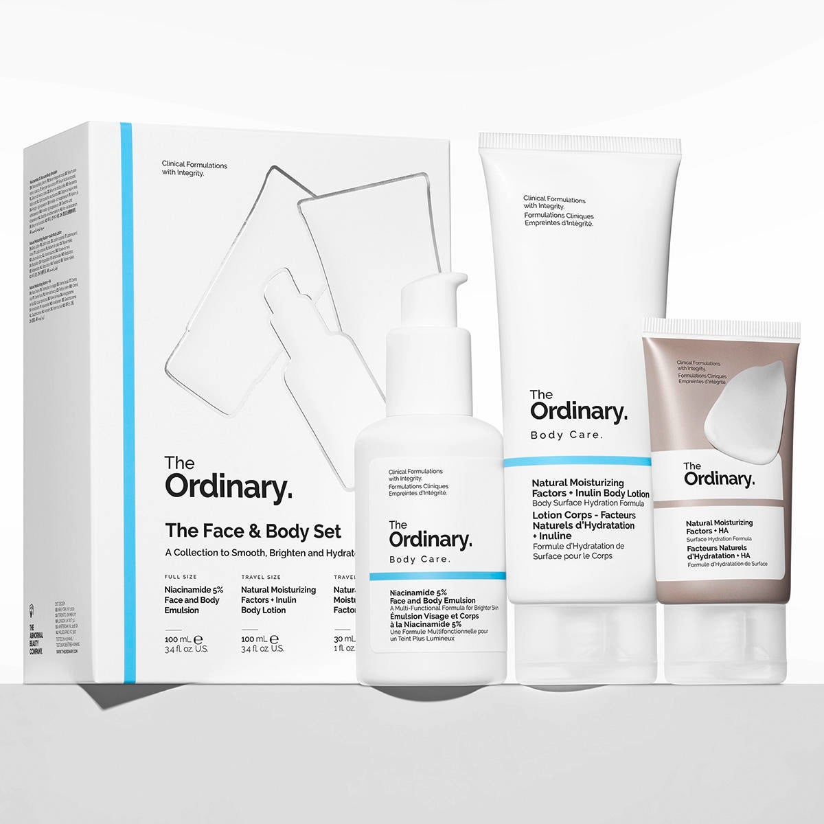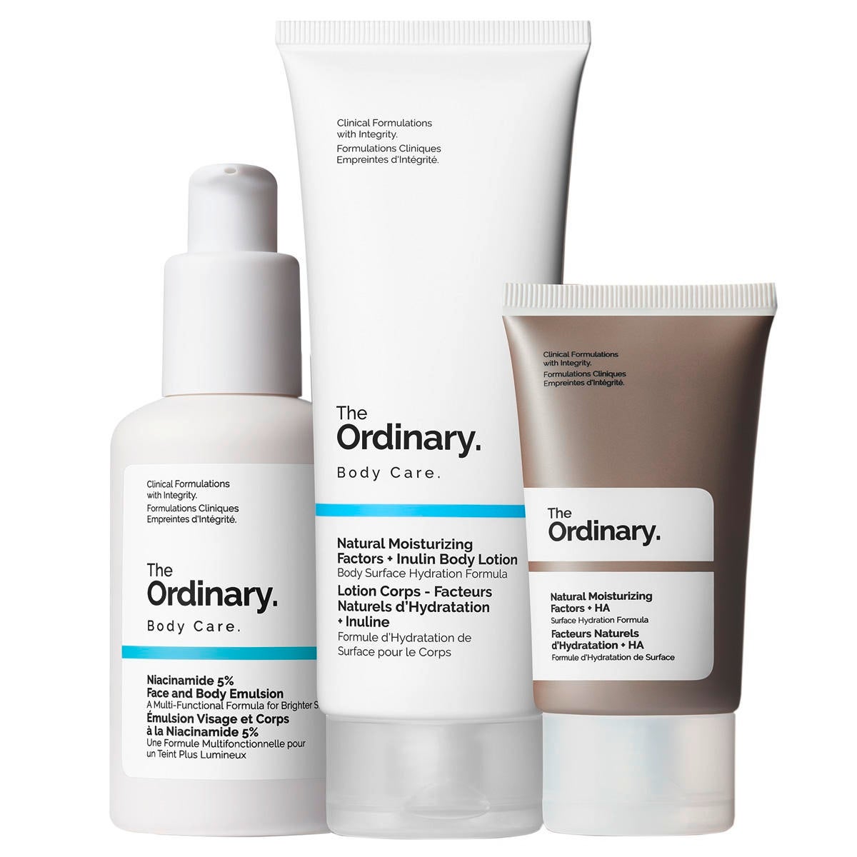 Niacinamide 5% Face and Body Emulsion ist eine multifunktionale Formel in Originalgröße, die das Erscheinungsbild von dunklen Flecken auf Gesicht und Körper reduziert und für einen gleichmäßigeren Hautton sorgt. Getestet auf allen Hauttönen, zielt sie auf dunkle Flecken im Gesicht, am Hals, auf der Brust und den Armen – wichtige Bereiche, die zu ungleichmäßigem Hautton neigen – und sorgt so für ein harmonisches Hautbild von Kopf bis Fuß. Natural Moisturizing Factors + Inulin Body Lotion ist eine leichte Körperpflege für alle Hauttypen, die die Haut auch nach dem Waschen hydratisiert hält. Die lotionartige Textur spendet sofort und den ganzen Tag über Feuchtigkeit und stärkt die Hautbarriere bereits nach einer Anwendung. Natural Moisturizing Factors + HA ist eine tägliche Gesichtspflege für alle Hauttypen, die die Hautbarriere stärkt und gleichzeitig sofortige sowie langanhaltende Feuchtigkeit spendet. Anwendung: Nach der Reinigung einige Tropfen der Niacinamide 5% Face and Body Emulsion auf die gewünschten Bereiche auftragen. Anschließend Natural Moisturizing Factors + Inulin auf den gesamten Körper auftragen und eine kleine Menge von Natural Moisturizing Factors + HA im Gesicht verwenden.