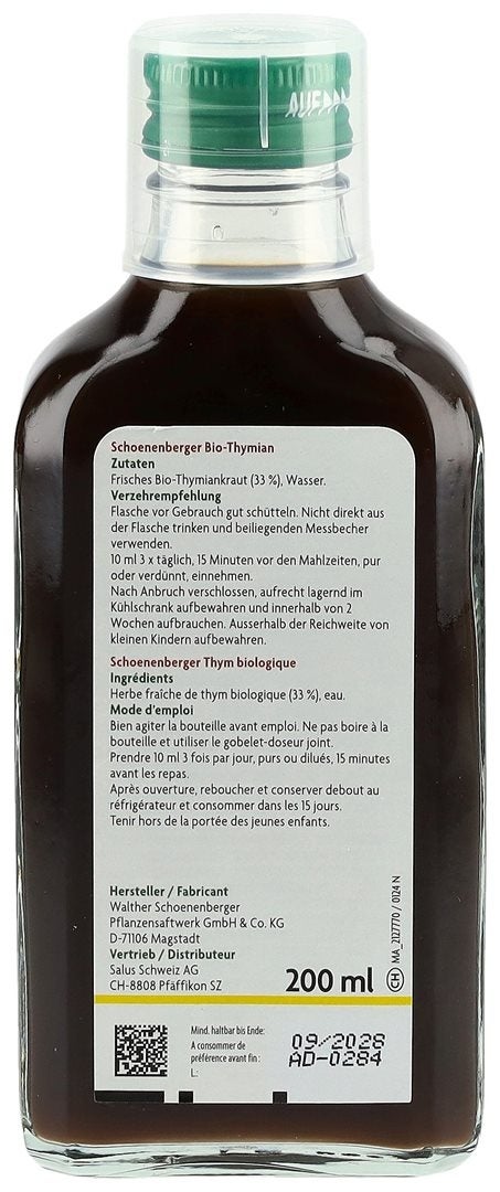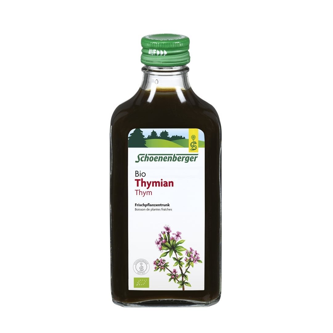 Der Schoenenberger Thymian Frischpflanzentrunk enthält den reinen Presssaft aus frischem Bio-Thymiankraut (Thymus vulgaris L., Thymus zygis L.) mit Wasser.