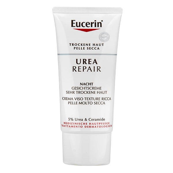 Intensive Pflege bei trockener und gespannter Gesichtshaut. Pflegt die Haut spürbar glatt und zart. Auch als regenerierende Nachtpflege. Eucerin UREA REPAIR Nacht Gesichtscreme 5 % ist eine intensive Gesichtspflege für trockene bis sehr trockene und spannende Haut. Urea und Lactat, zwei natürliche, feuchtigkeitsbindende Präparate versorgen die trockene Gesichtshaut sofort mit Feuchtigkeit und lindern das Spannungsgefühl. Sie mildert jedoch nicht nur Rauigkeit, sondern glättet durch die keratolytische Wirkung des Wirkstoffs Urea auch die Haut. Da die Creme Trockenheit, Spannungsgefühl und Rauigkeit verringert, ist sie zur Linderung der Symptome trockener Haut, zum Beispiel durch Psoriasis, geeignet. Auch bei Altershaut. Anwendung: Reinigen Sie das Gesicht und tupfen Sie die Haut trocken. Die Creme sanft im Gesicht und am Hals einmassieren. Jeden Abend auftragen. Die Haut ist Faktoren wie Wetter, aggressiver Reinigungspflege und natürlicher Alterung ausgesetzt. Das kann zu Feuchtigkeitsverlust und somit zu Symptomen trockener Haut führen: Die Haut fühlt sich unangenehm rau an, spannt, juckt oder neigt zu Schuppenbildung. Die Produkte der UreaRepair Pflegeserie sind angereichert mit Urea (Harnstoff) und weiteren natürlichen Feuchthaltefaktoren (Natural Moisturing Factor = NMF) – für eine intensive Versorgung mit Feuchtigkeit. Eucerin UreaRepair PLUS lindert dank einzigartigem Repair-PLUS-Komplex sofort die Anzeichen trockener Haut und bietet 48 h lang anhaltenden Schutz. Eucerin UreaRepair ORIGINAL bietet Ihnen die bewährte und reichhaltige Urea-Pflege. Alle Produkte sind dermatologisch getestet und auch ideal zur Pflege trockener Haut im Alter sowie therapiebegleitend bei verschiedenen Krankheiten wie Keratosis pilaris oder Diabetes geeignet.