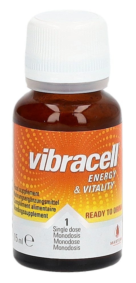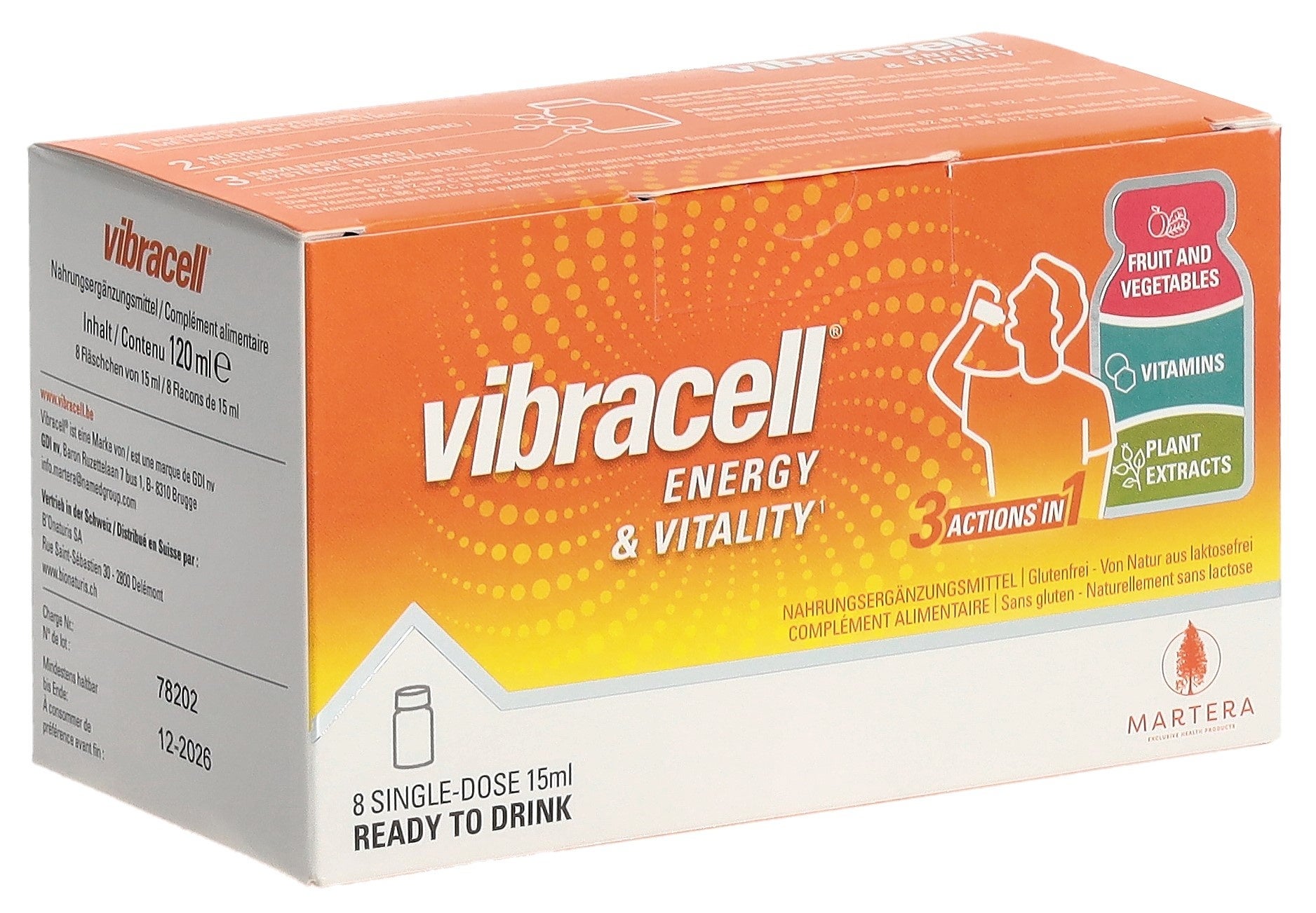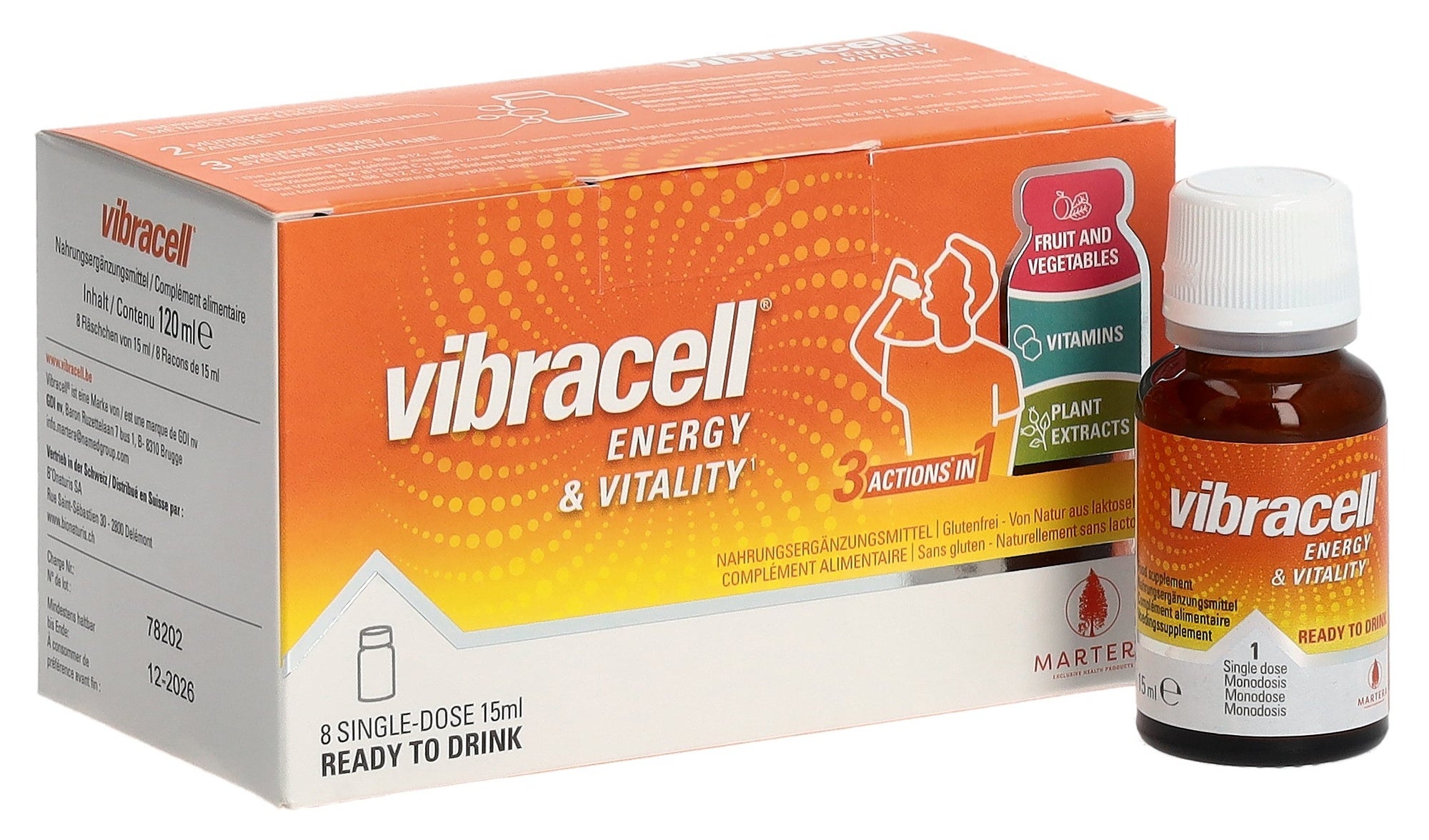 Vibracell Energy & Vitality ist ein hochwertiges, flüssiges Nahrungsergänzungsmittel auf Basis von Frucht- und Gemüsesäften, angereichert mit Vitaminen, Pflanzenextrakten und L-Carnitin. Die praktische Box mit 8 trinkfertigen Einzeldosen à 15 ml unterstützt Energie, Vitalität und das allgemeine Wohlbefinden – ideal für einen aktiven Alltag.