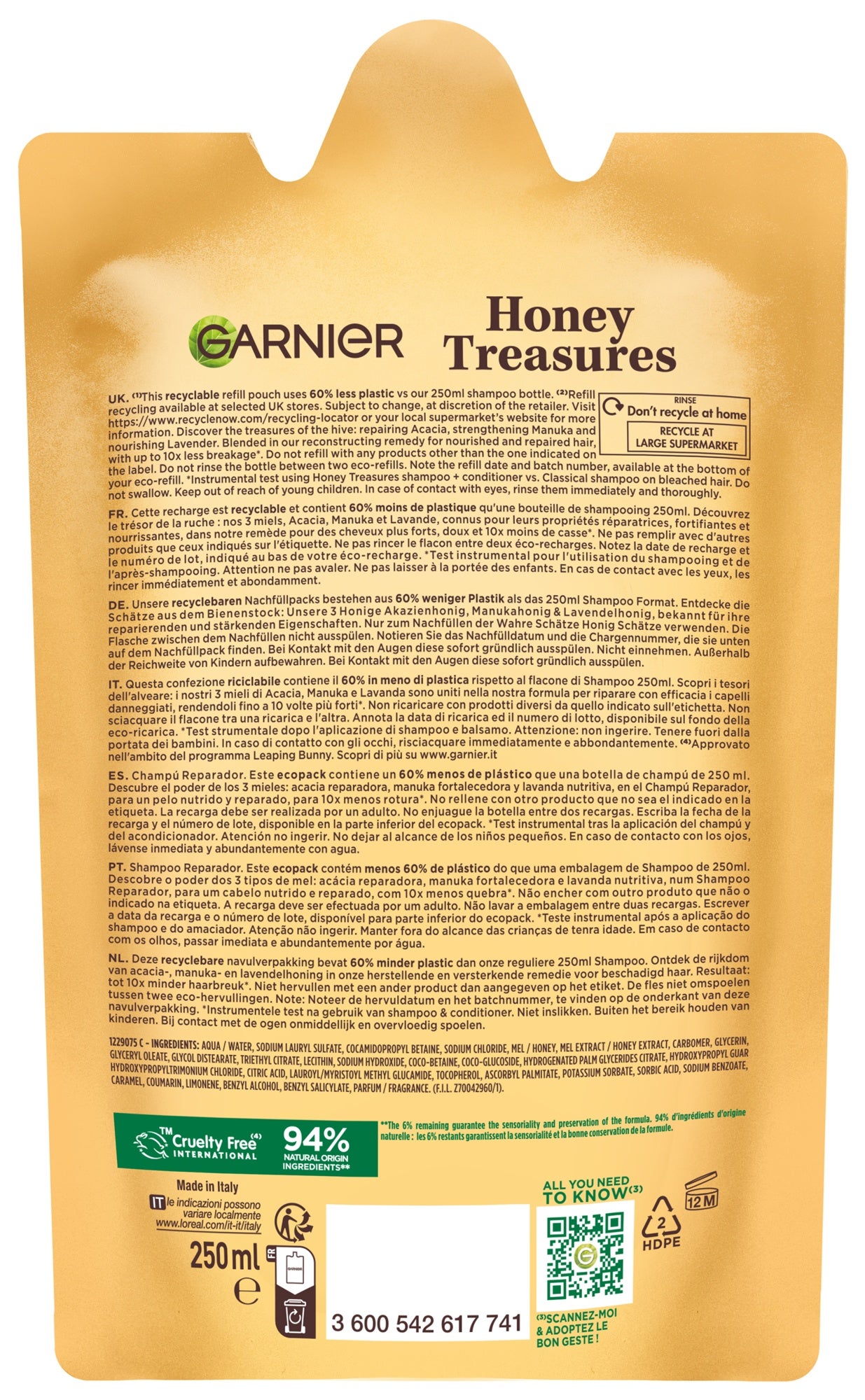 Strapaziertes, brüchiges Haar adé – Garnier Reparierendes Shampoo Honig Schätze vereint die Kraft von Schätzen aus dem Bienenstock, um das geschädigte Haar zu reparieren und wieder aufzubauen. Sowohl der reparierende Akazienhonig als auch das schützende Bienenwachs sind nachhaltig bezogen. Repariert und gekräftigt bis in die Spitzen wird das Haar spürbar geschmeidig und leicht zu kämmen. Bonus: der wunderbare Honigduft.