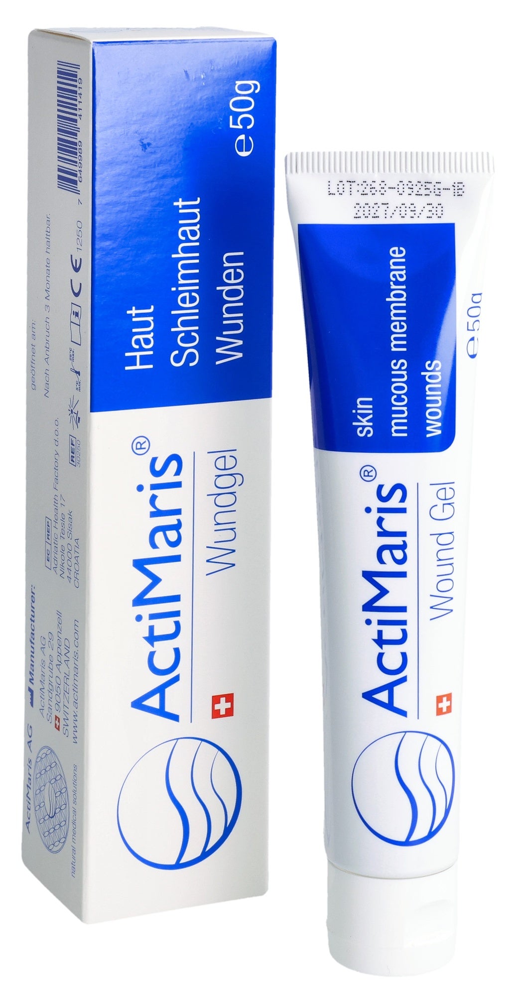 ActiMaris Wundgel besteht aus basisch ionisiertem Meerwasser mit Meersalz (3,0 %), Oxychlorit NaOCl (0,2 %) und Lithiummagnesiumnatriumsilikat.