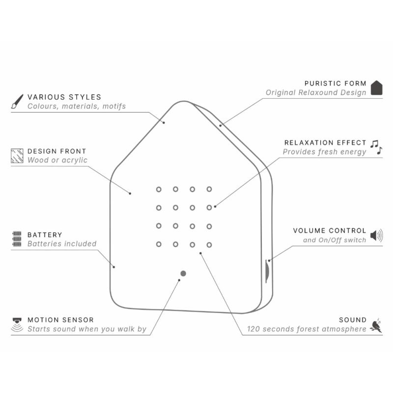 Unsere Relaxound Zwitscherbox schenkt Dir wertvolle Momente der Entspannung. Beruhigende Natursounds lassen Dich durch einen morgendlichen Wald wandeln: Das fröhliche Zwitschern von Amseln und anderen Singvögeln beruhigt sofort. Du spürst, wie sich Kopf und Körper intuitiv entspannen und frei werden.